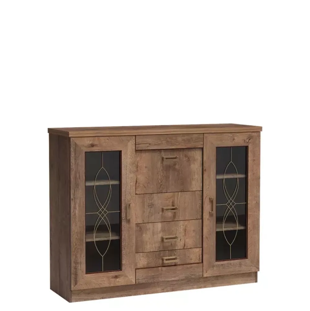 Zestaw mebli do salonu TAVIER jest kompletną propozycją, która dzięki wykonaniu w eleganckiej stylistyce doskonale sprawdzi się w klasycznej aranżacji salonu. W skład zestawu wchodzi przeszklona komoda z czterema szufladami, w której znajdziesz miejsce na swoje akcesoria wraz z witryną z dwiema pojemnymi szufladami oraz trzema półkami. W zestawie nie zabrakło również szafki RTV z szufladami oraz stolika kawowego