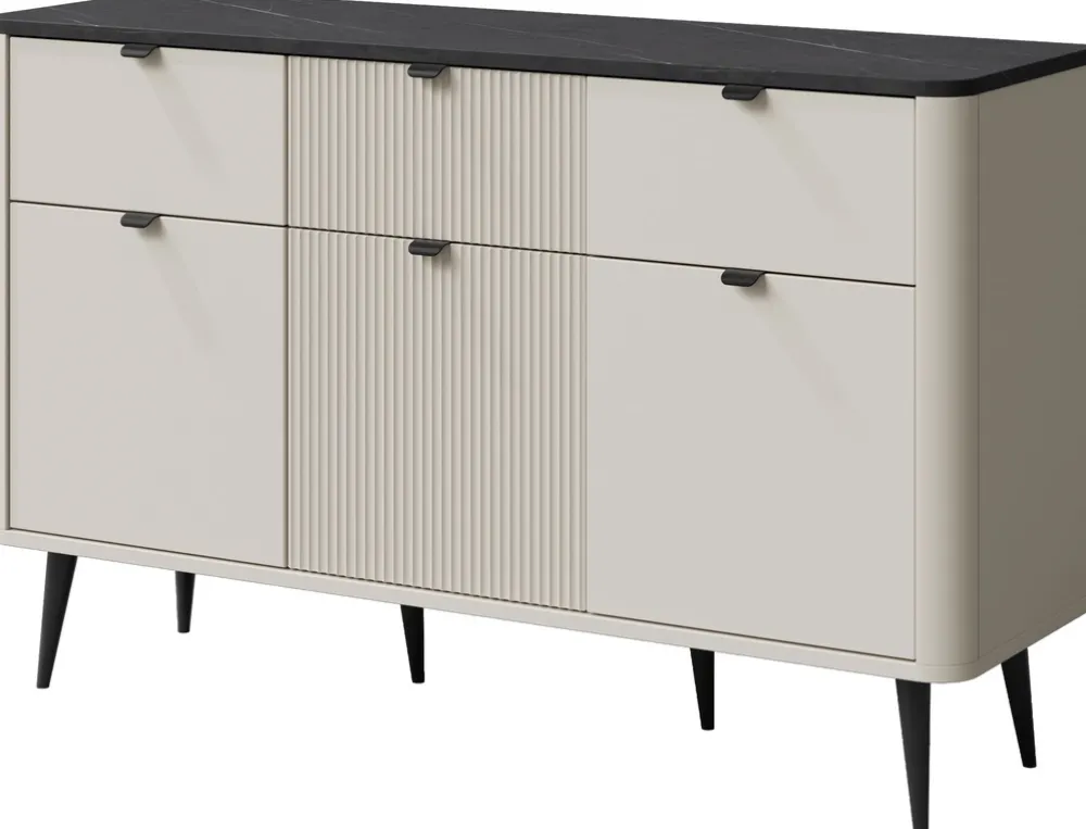 Frezowane fronty środkowe stanowią elegancki akcent, który przyciąga spojrzenia i wprowadza do wnętrza nutę luksusu. Smukłe, 18-centymetrowe nóżki dodają komodzie wizualnej lekkości i sprawiają, że mebel prezentuje się nowocześnie i lekko.