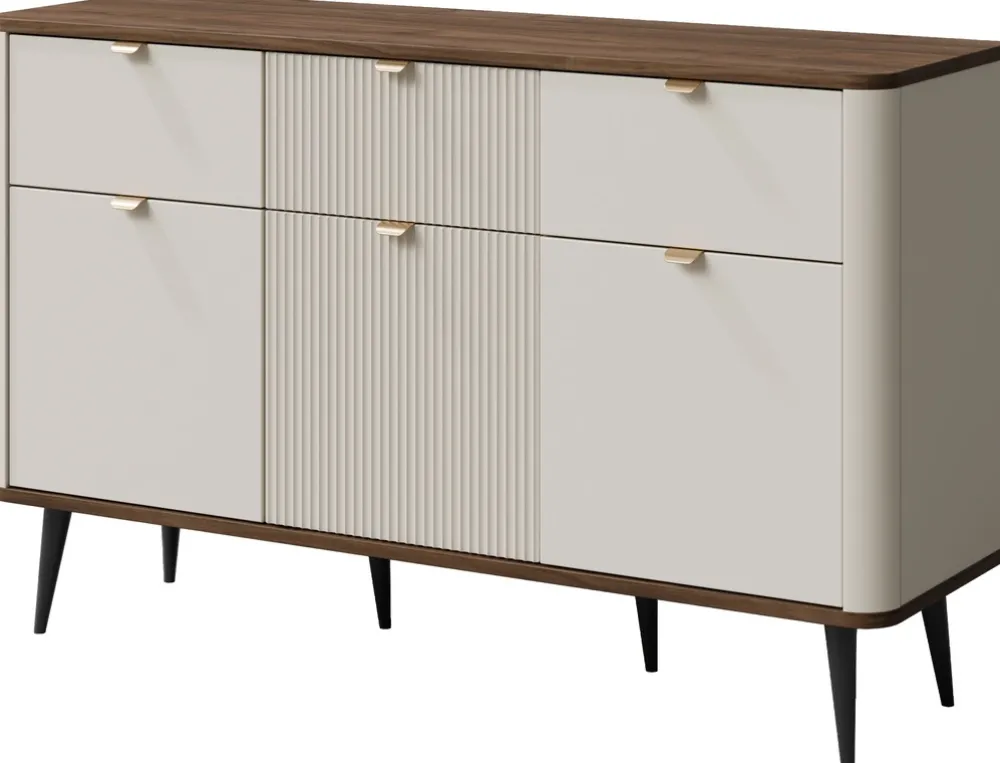 Frezowane fronty środkowe stanowią elegancki akcent, który przyciąga spojrzenia i wprowadza do wnętrza nutę luksusu. Smukłe, 18-centymetrowe nóżki dodają komodzie wizualnej lekkości i sprawiają, że mebel prezentuje się nowocześnie i lekko.