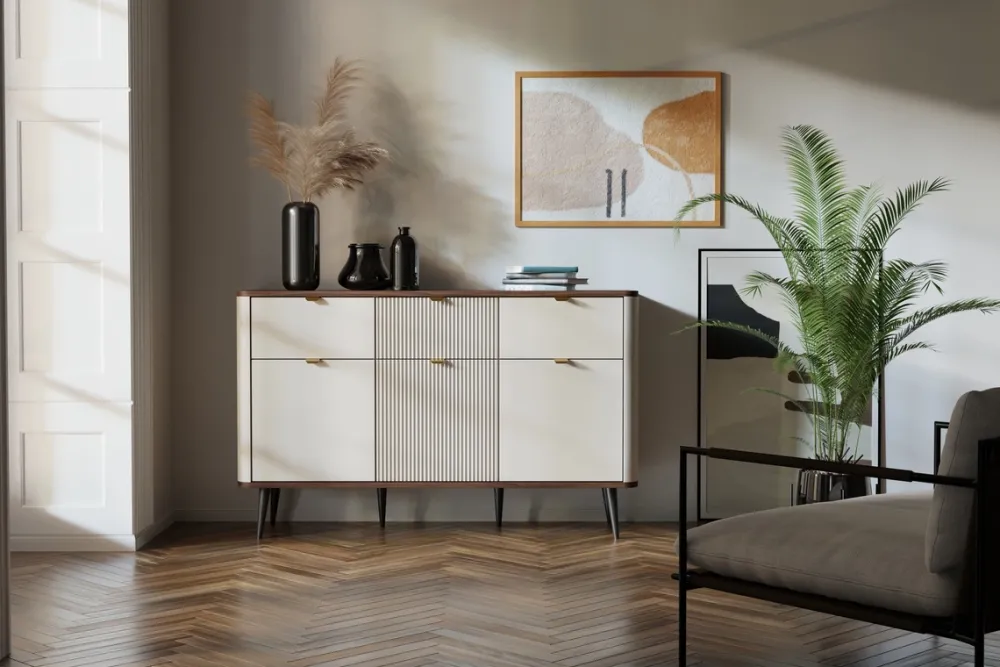Komoda do salonu z frezowanymi frontami – elegancki akcent i praktyczne wnętrze