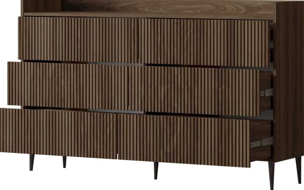 - Elementy zestawu: komoda 6-szufladowa, komoda z 3 szufladami i drzwiami, regał, szafka RTV, stolik kawowy