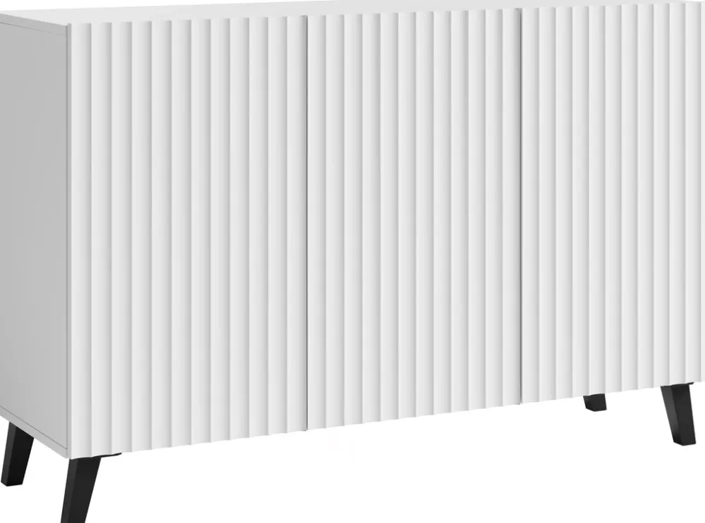 Komoda do salonu PUNES to elegancki i funkcjonalny mebel, który doskonale pasuje do nowoczesnych wnętrz. Jest utrzymana w minimalistycznym stylu, z ryflowanymi frontami dodającymi jej subtelnego uroku i elegancji. Korpus komody wykonany jest z płyty laminowanej o grubości 15 mm, co zapewnia jej trwałość i solidność. Fronty z wysokiej jakości płyty MDF o grubości 18 mm są zabezpieczone wodoodporną folią, która chroni mebel przed wilgocią i ułatwia jego czyszczenie.