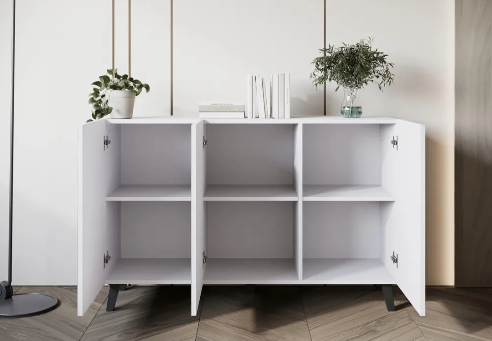 Szeroka komoda do salonu PUNES wyposażona jest w trzy drzwi, za którymi kryją się półki. Dodatkowo wysokość półek można regulować, co pozwala na dostosowanie przestrzeni według indywidualnych potrzeb.