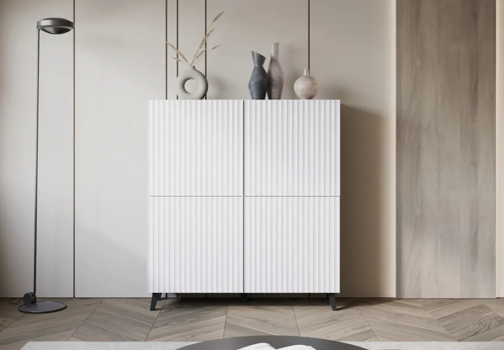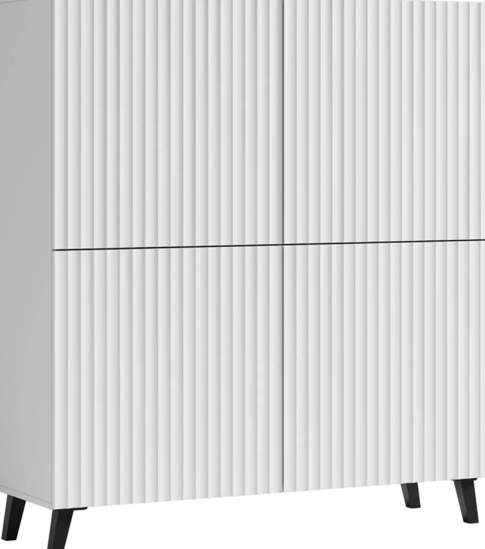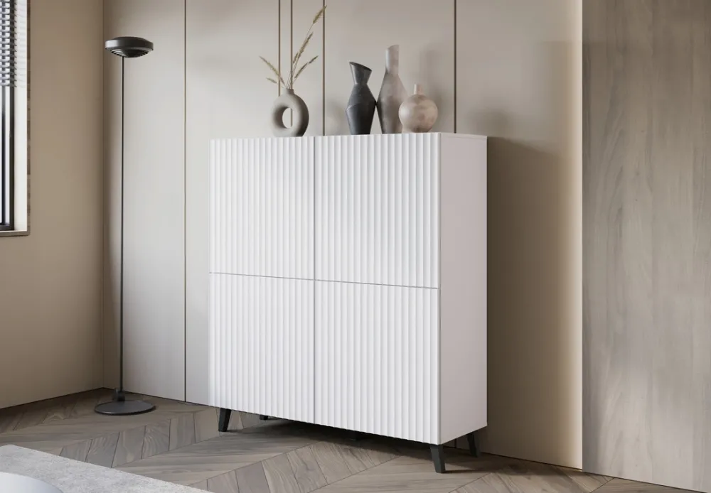 Wysoka komoda do salonu PUNES to elegancki i funkcjonalny mebel, który doskonale pasuje do nowoczesnych wnętrz. Jest utrzymana w minimalistycznym stylu, z ryflowanymi frontami dodającymi jej subtelnego uroku i elegancji. Korpus komody wykonany jest z płyty laminowanej o grubości 15 mm, co zapewnia jej trwałość i solidność. Fronty z wysokiej jakości płyty MDF o grubości 18 mm są zabezpieczone wodoodporną folią, która chroni mebel przed wilgocią i ułatwia jego czyszczenie.
