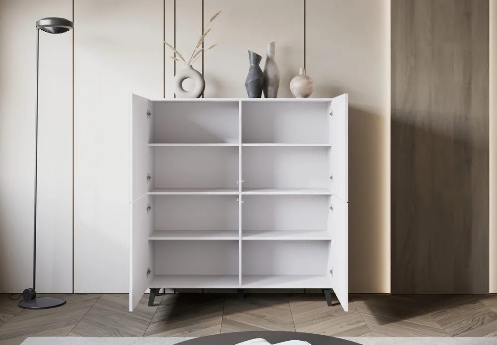 Biała komoda do salonu PUNES wyposażona jest w cztery drzwi, za którymi kryją się półki. Dodatkowo wysokość półek można regulować, co pozwala na dostosowanie przestrzeni według indywidualnych potrzeb.