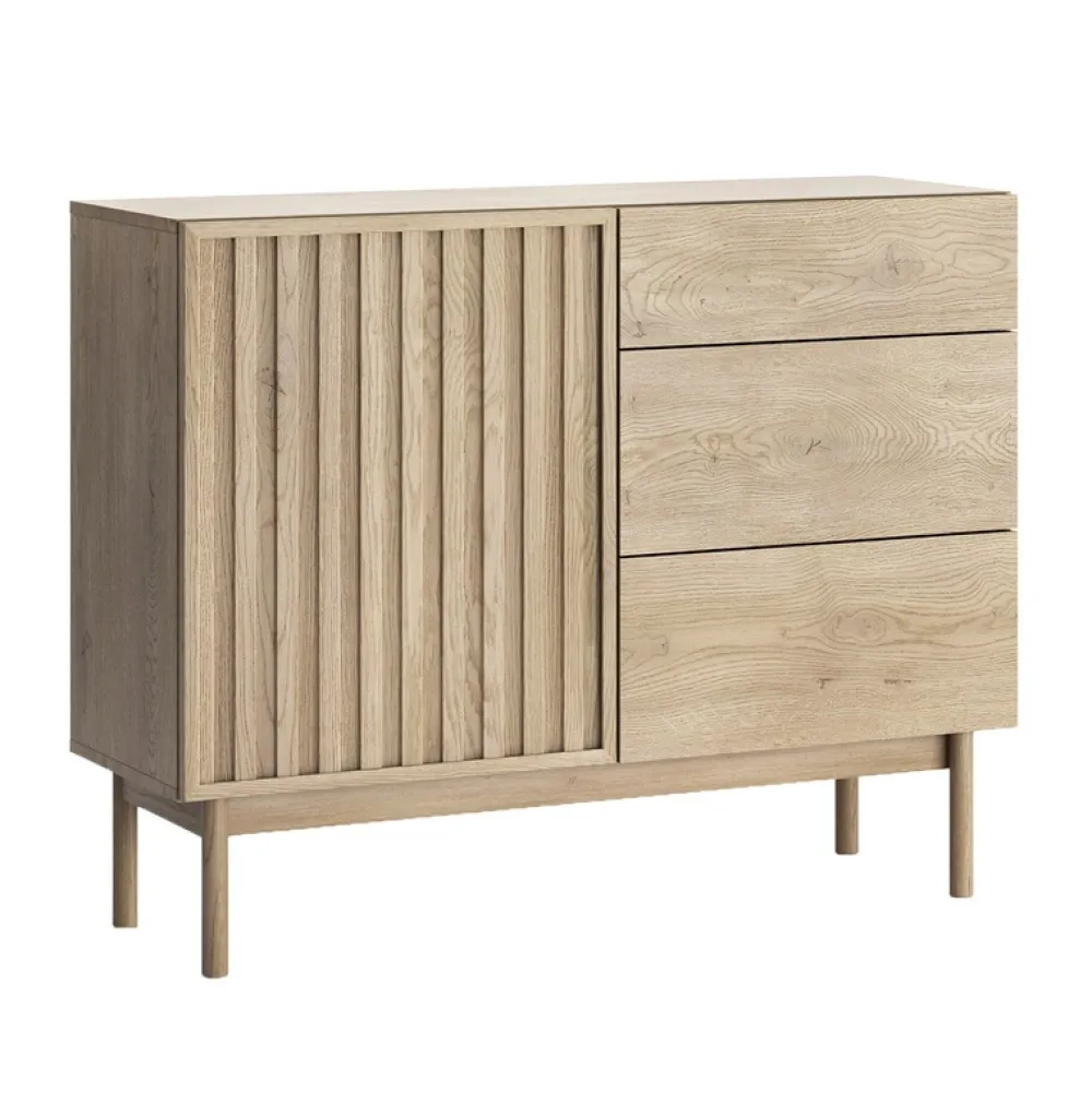 - Komoda SOLVO 106 cm z ryflowanym frontem w kolorze dąb cremona, systemem push to open, 3 szufladami i szafką. Nowoczesna forma, wysokie drewniane nóżki i trwała płyta laminowana – idealna do salonu, sypialni lub przedpokoju.