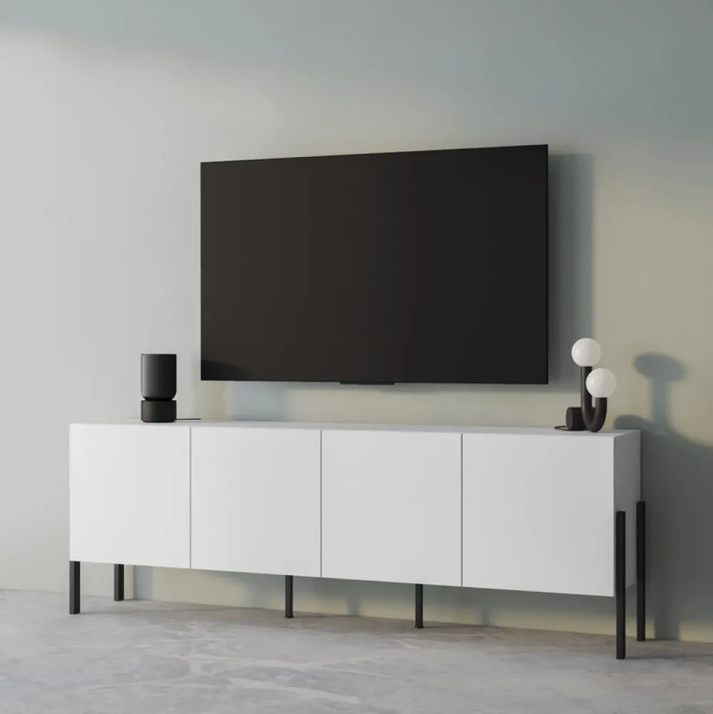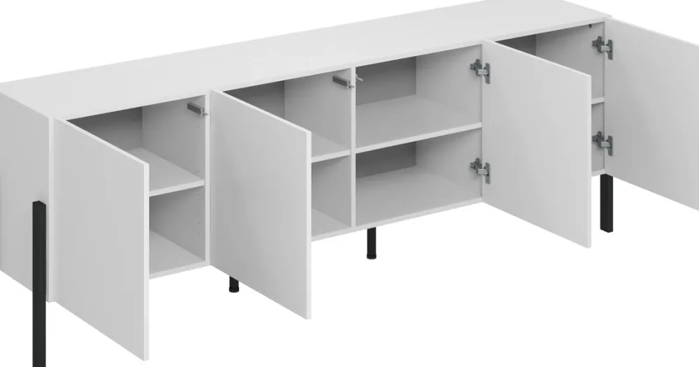 - Komoda JUKON w kolorze biały mat to pojemny mebel z czterema drzwiami i praktycznymi półkami. Idealna do salonu. Prosty design, trwałe materiały i eleganckie czarne nóżki nadają wnętrzu lekkości.