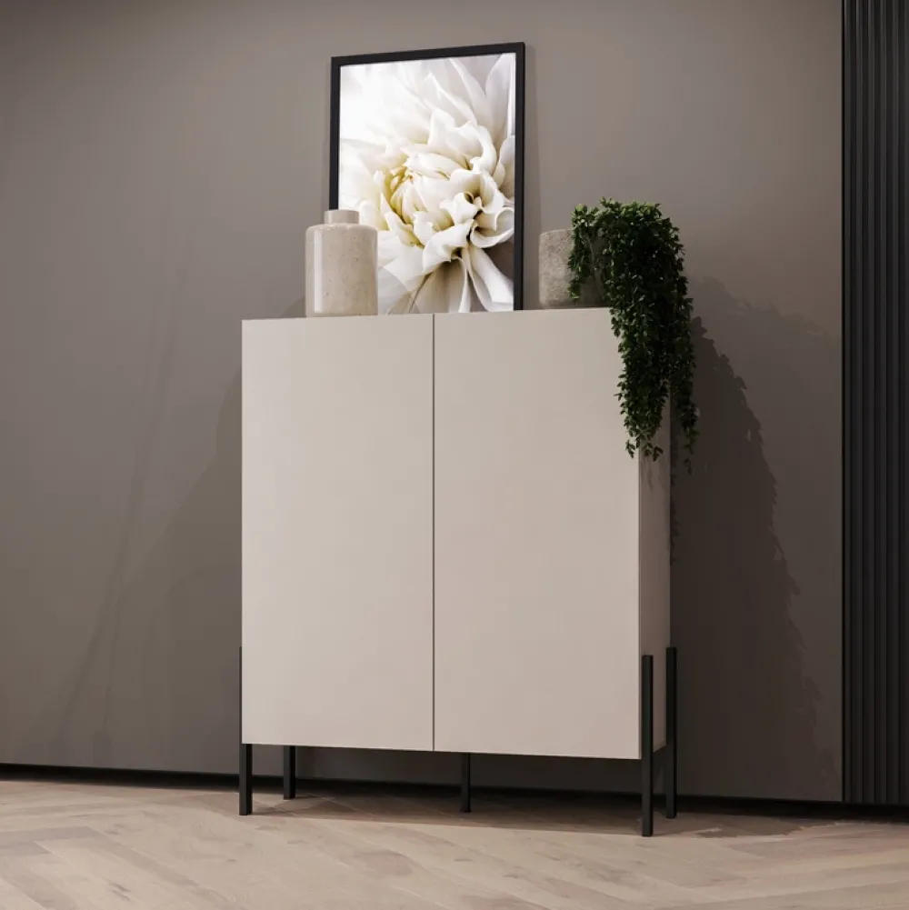 Komoda beżowa o wysokości 135 cm to idealny wybór dla miłośników nowoczesnego, minimalistycznego stylu. Zgrabna, ale pojemna – oferuje aż sześć przegród za eleganckimi, gładkimi frontami bez uchwytów. Dzięki systemowi Push To Open codzienne użytkowanie jest intuicyjne i komfortowe, a czarne, metalowe nóżki dodają bryle lekkości i charakteru.