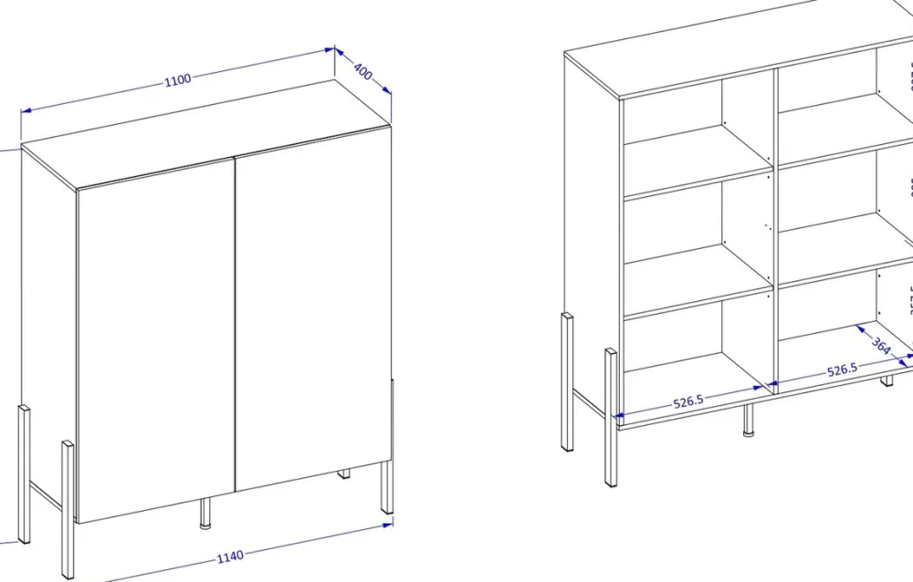 - Wysoka komoda z półkami – idealna do przechowywania dokumentów, zastawy, ubrań czy dekoracji