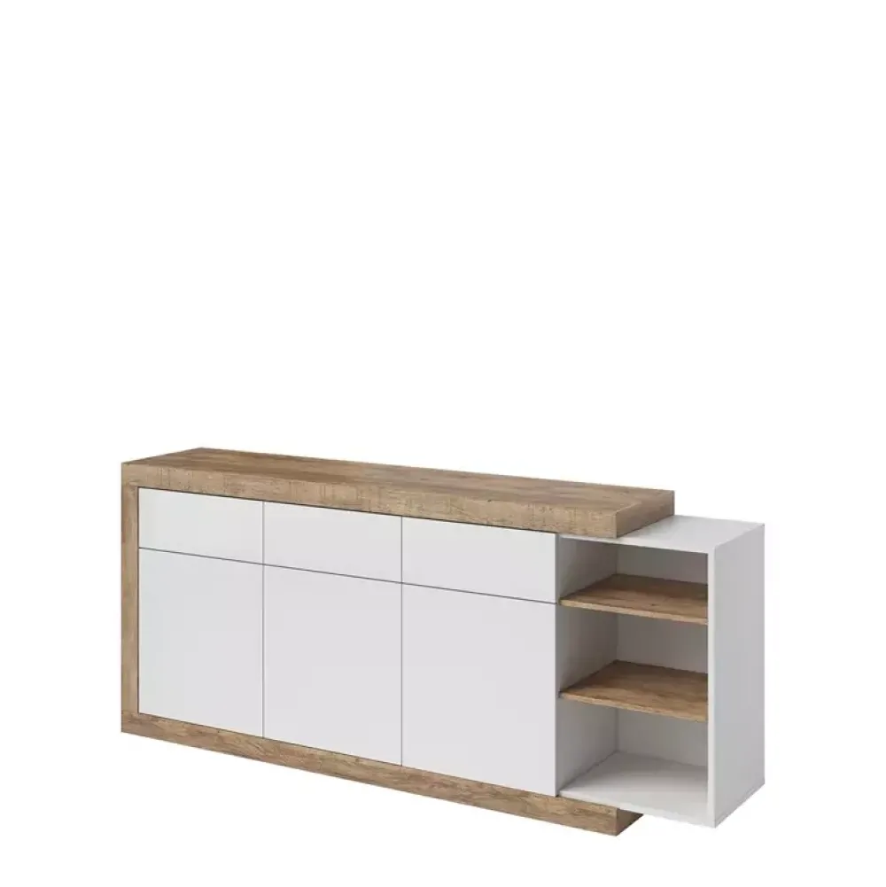 - Nowoczesna komoda z uchylnymi drzwiami, szufladami oraz otwartymi półkami o szerokości 200 cm.
