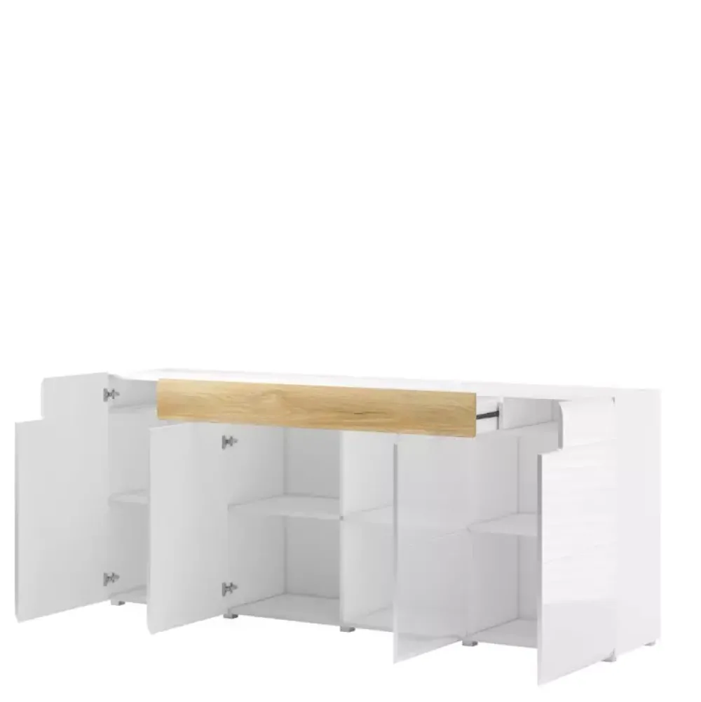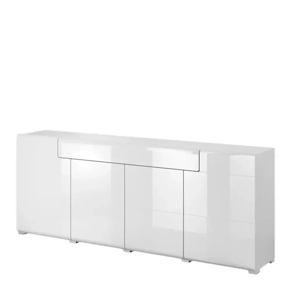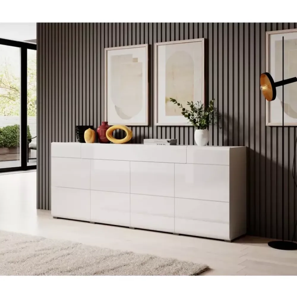 - Duża komoda o szerokości 208 cm z drzwiami uchylnymi oraz szufladą.