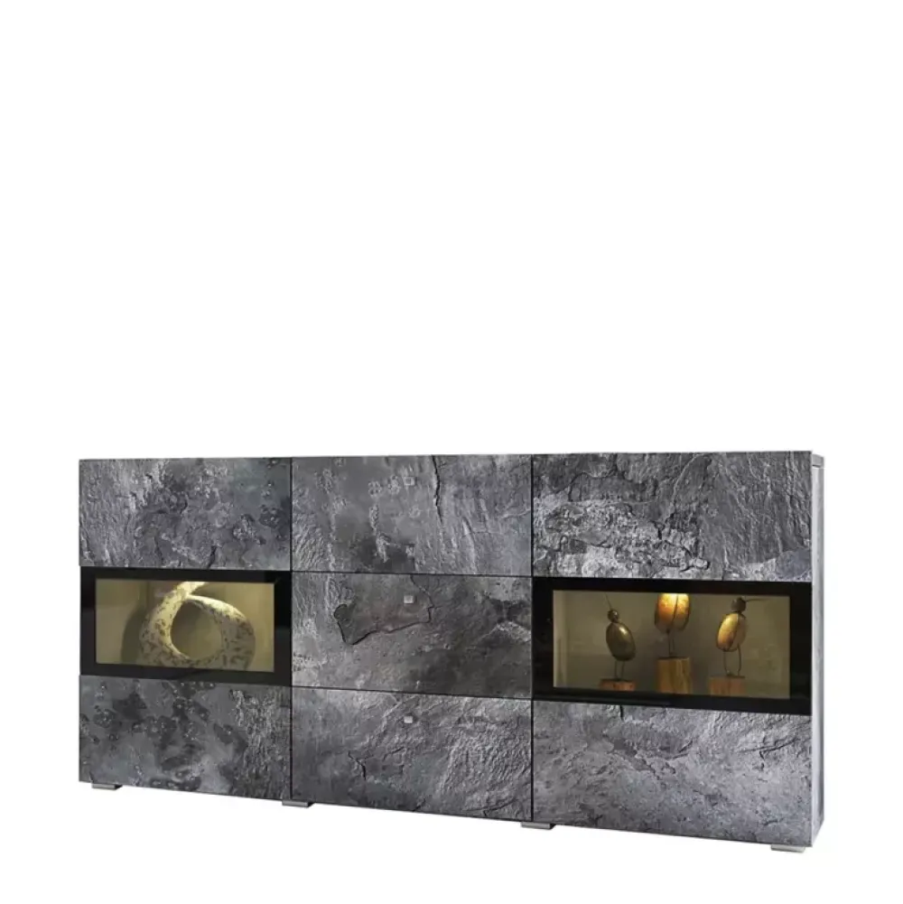 Industrialna komoda do salonu z oszklonymi drzwiczkami uchylnymi oraz szufladami