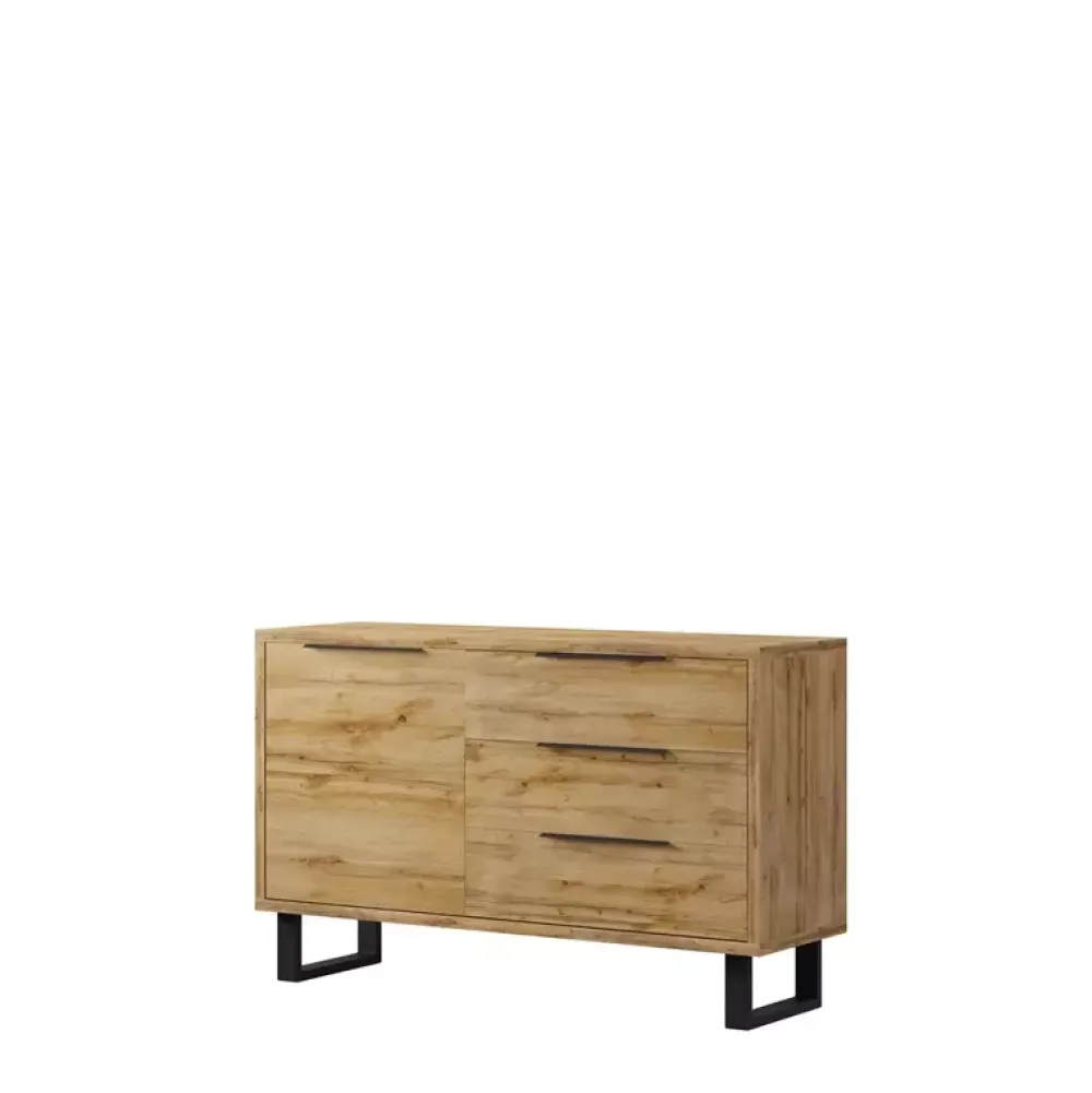 Industrialna komoda do salonu o szerokości 144 cm z szufladami oraz drzwiczkami uchylnymi.