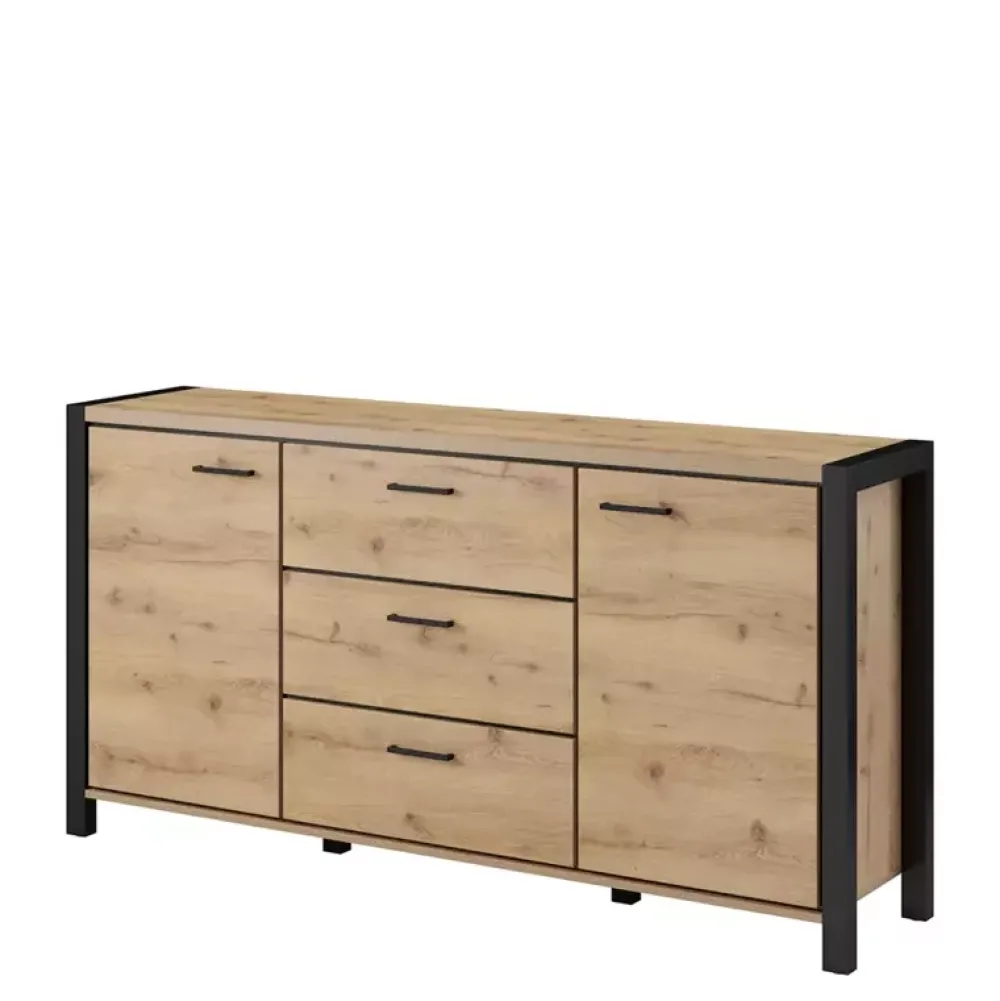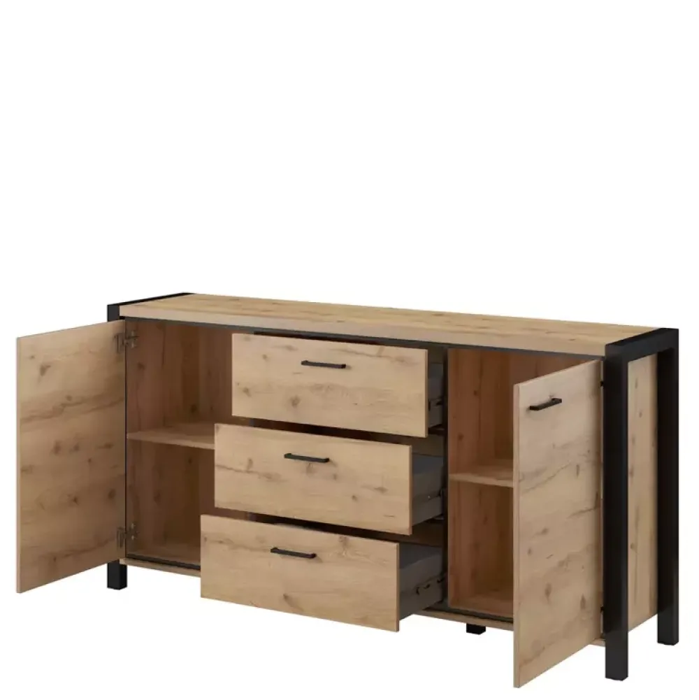 Komoda ANGELINO została wyposażona w trzy pojemne szuflady osadzone na prowadnicach kulkowych z pełnym wysuwem, w których znajdziesz miejsce na swoje drobne akcesoria. Dodatkowo komoda została wyposażona w drzwi po lewej oraz prawej stronie, gdzie za każdymi z nich swoje miejsce znalazła półka. Natomiast uchwyty komody dzięki wykonaniu z metalu w matowym wykończeniu oraz czarnym kolorze stanowią stanowią solidną opcję, oraz dodają komodzie industrialnych akcentów stylistycznych.