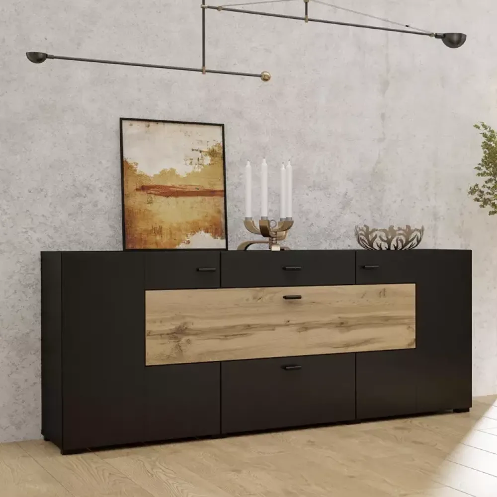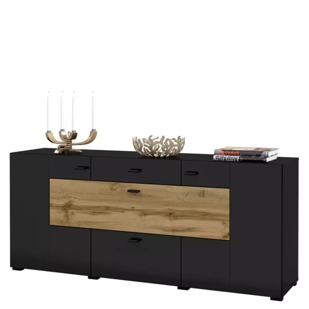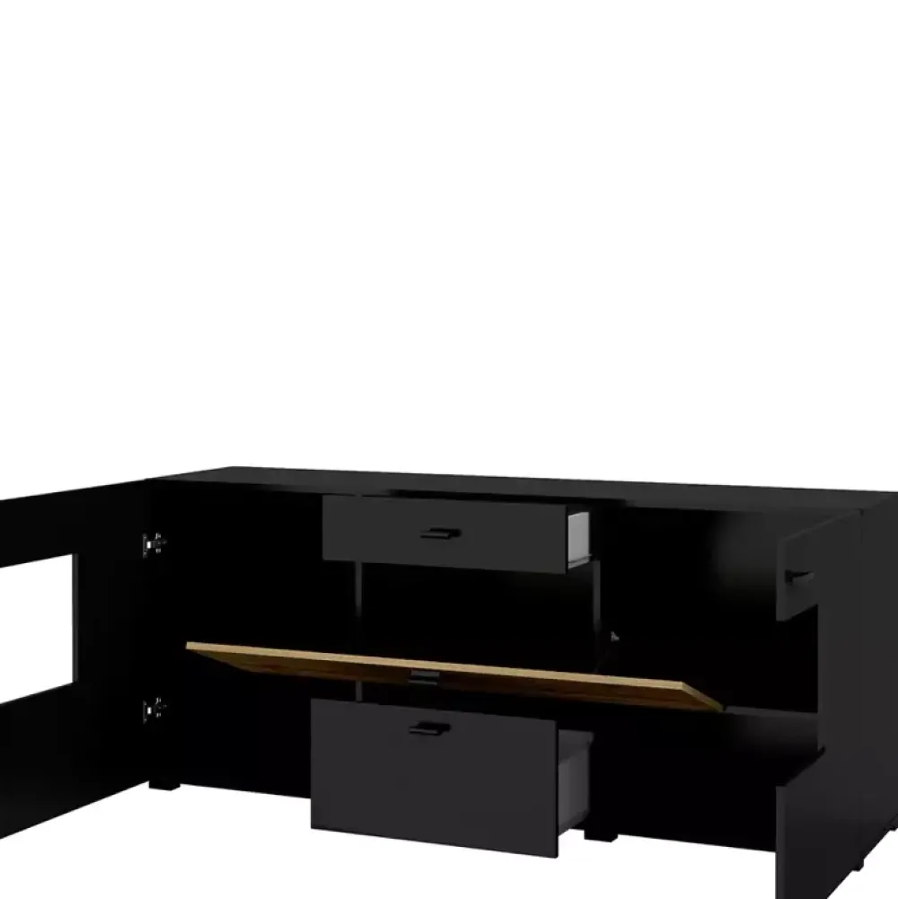 Komoda CAMBODE została wykonana w nowoczesnej stylistyce, dzięki której doskonale odnajduje się we współczesnych aranżacjach salonów, czyniąc je eleganckimi oraz niepowtarzalnymi. Komoda posiada drzwi po prawej oraz lewej stronie, gdzie za każdymi z nich znajduje się jedna półka, natomiast w jej centralnej części swoje miejsce znalazły dwie pojemne szuflady osadzone na prowadnicach rolkowych. Dodatkowo pomiędzy szufladami znajdują się drzwi uchylne, za którymi można umieścić rozmaite akcesoria.