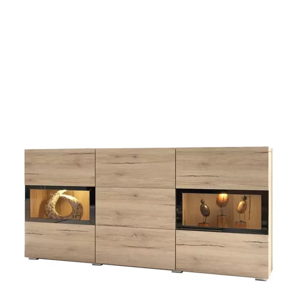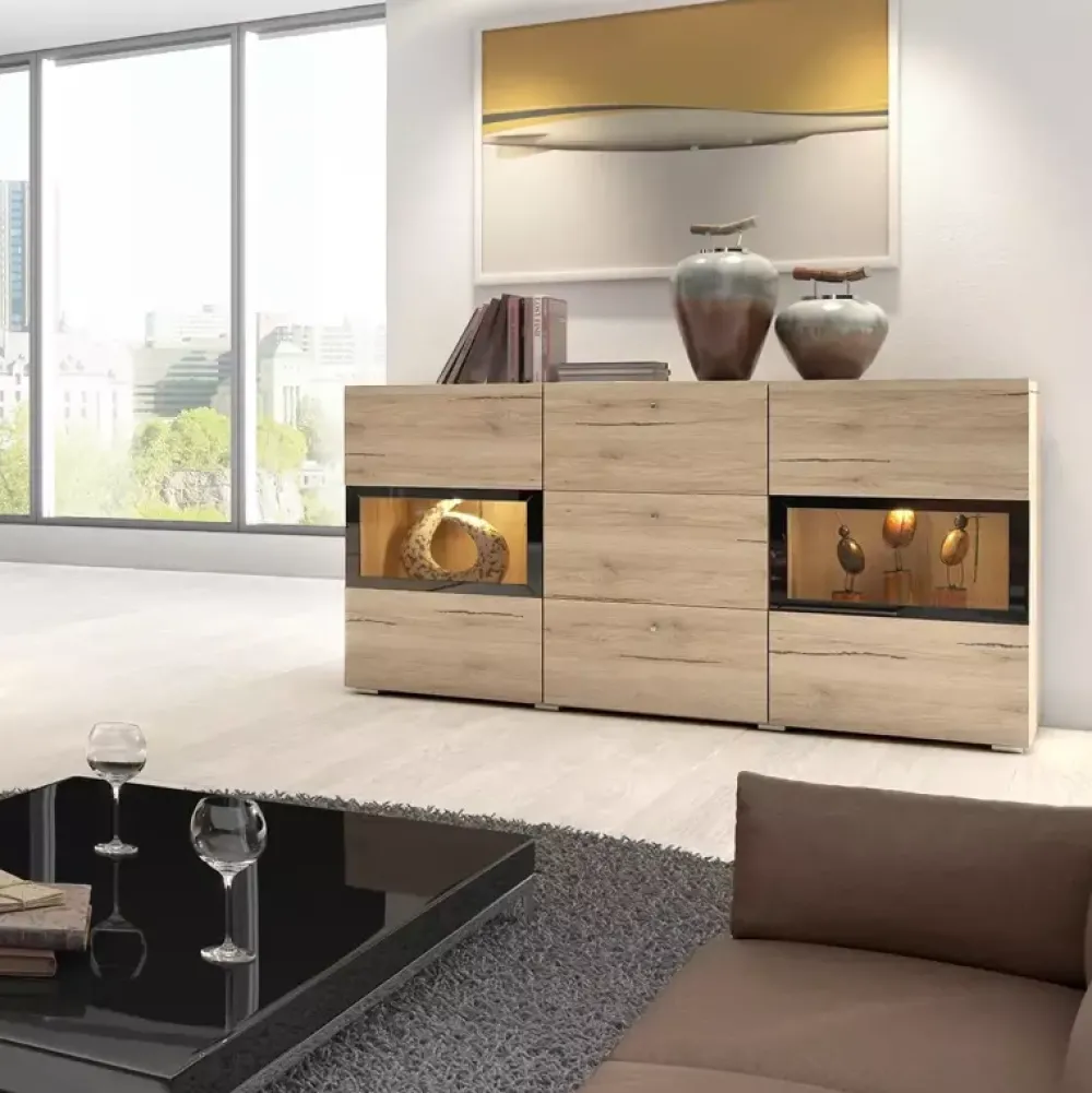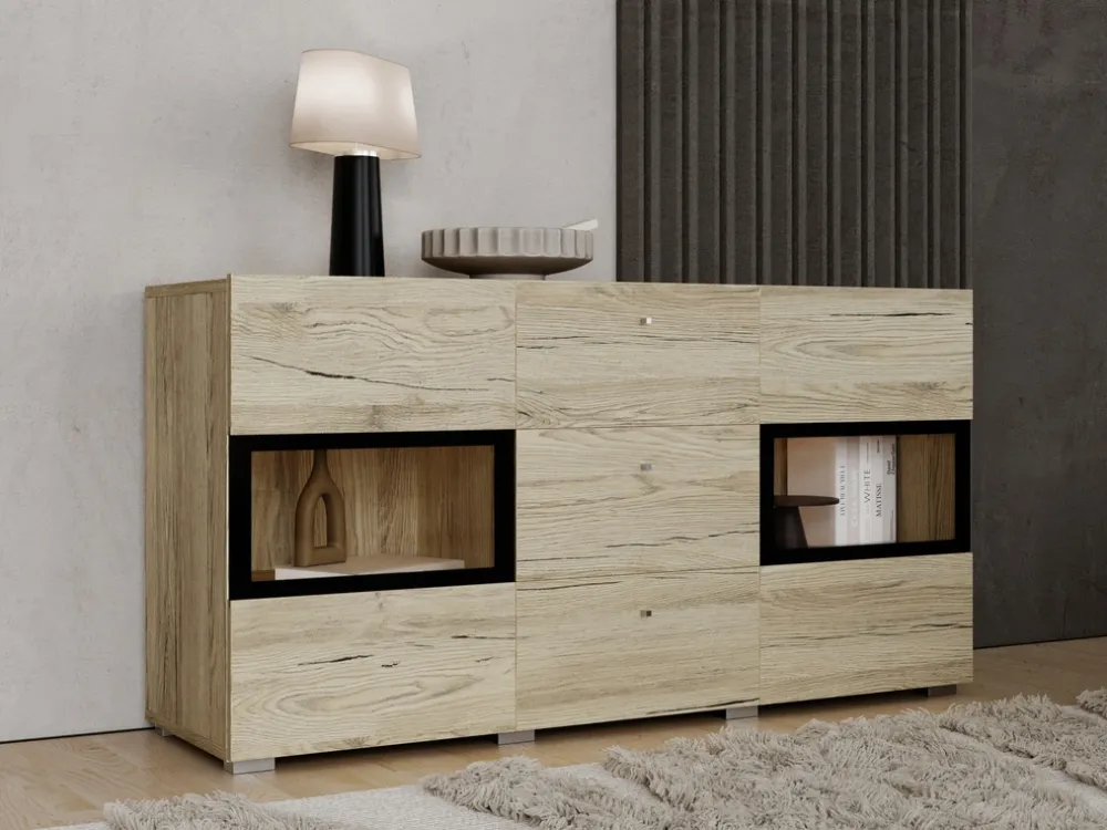 - Komoda do salonu z oszklonymi drzwiczkami uchylnymi oraz szufladami