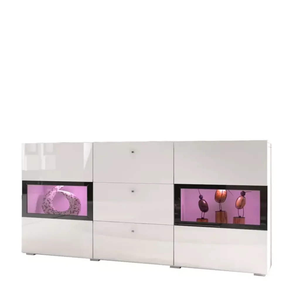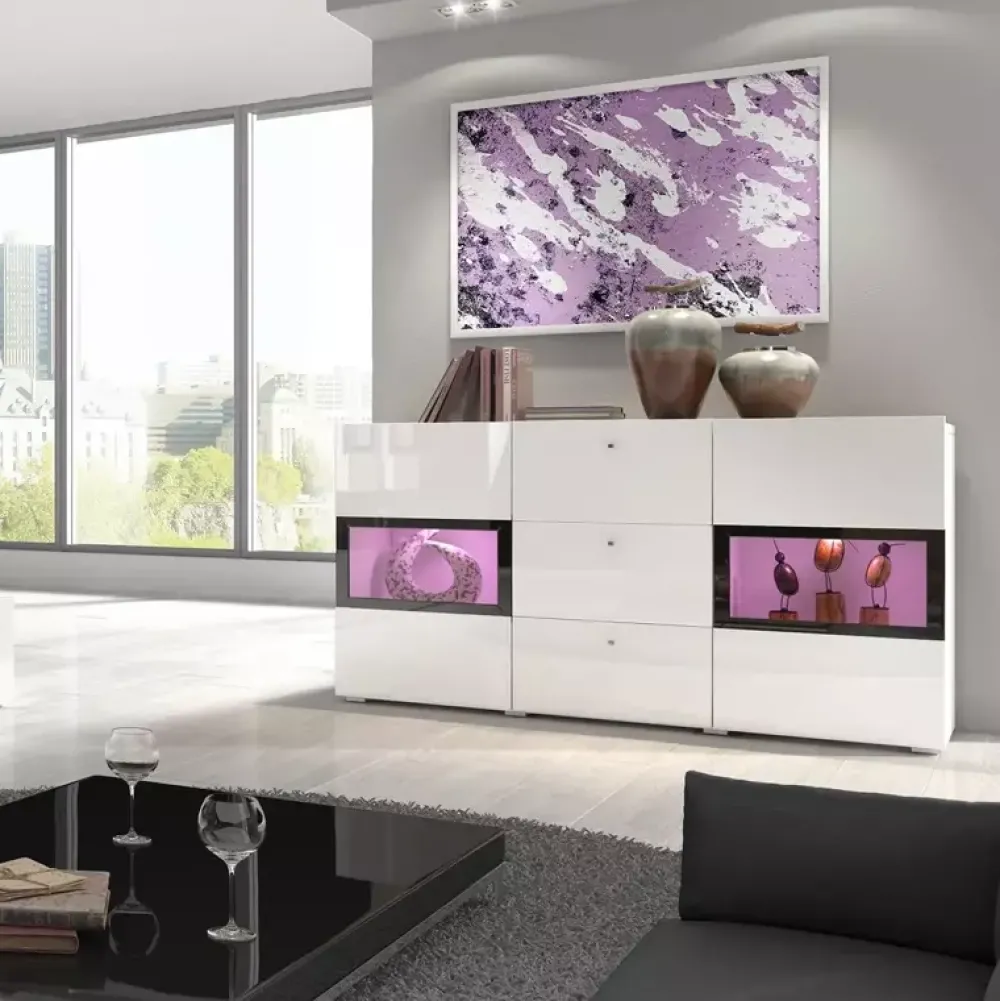 Nowoczesna komoda do salonu z oszklonymi drzwiczkami uchylnymi oraz szufladami