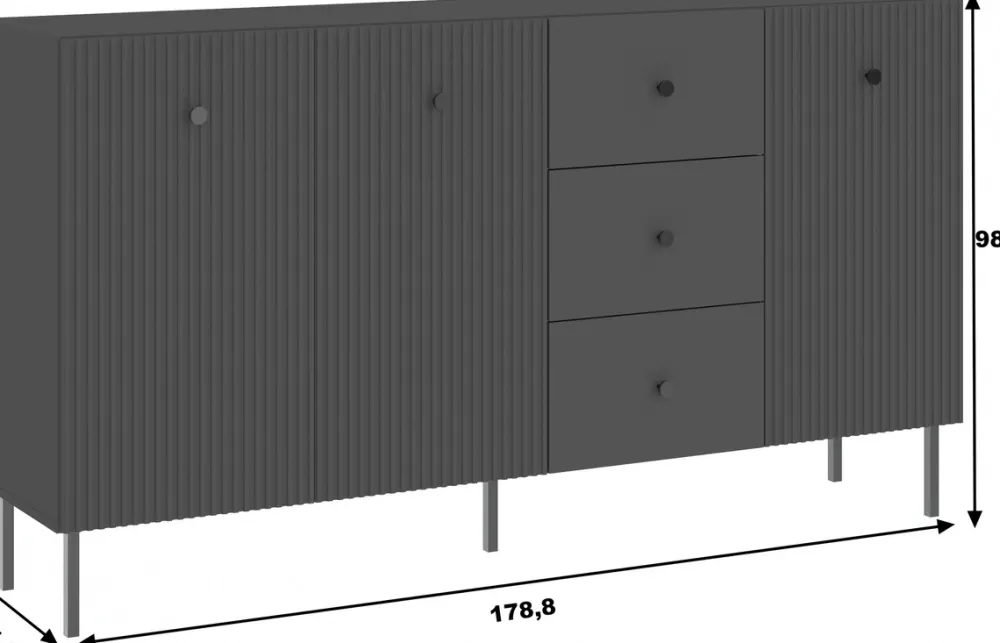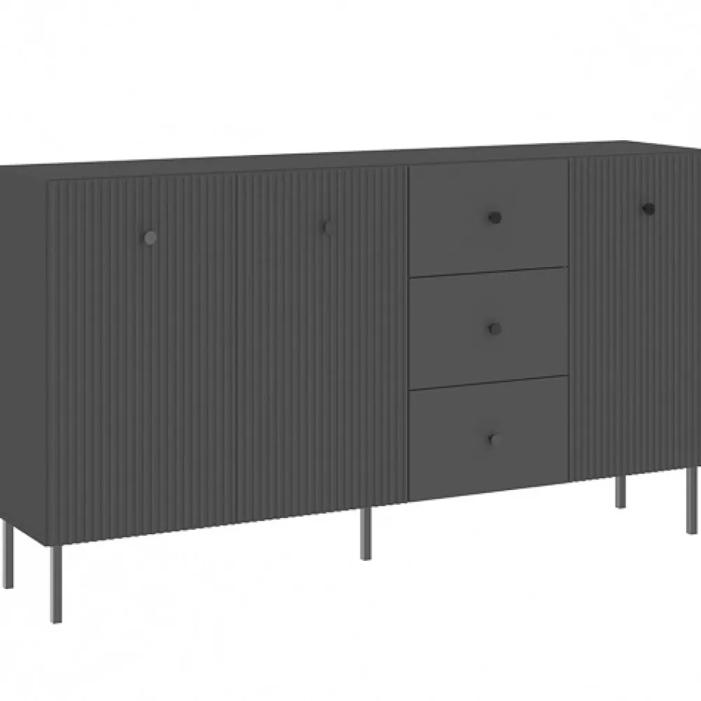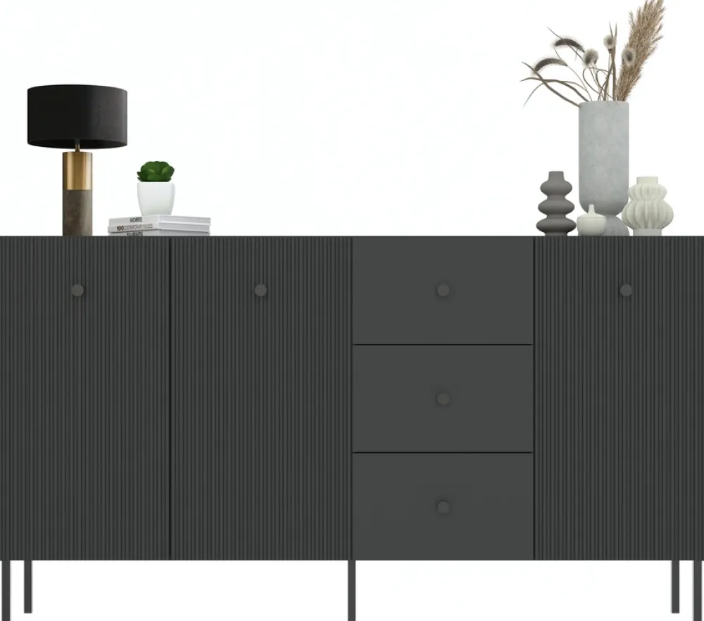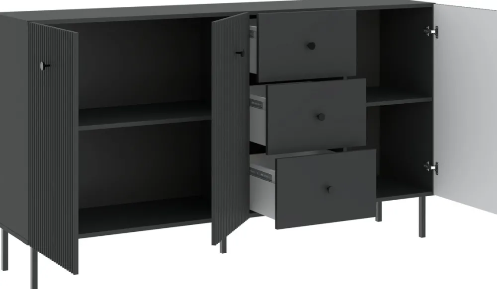 Komoda trzydrzwiowa do salonu VALTEO to propozycja dla osób ceniących designerskie rozwiązania oraz praktyczne meble do przechowywania. Jej czarny kolor i dekoracyjne lamele na frontach przyciągają wzrok, nadając wnętrzu luksusowego charakteru. Trzydrzwiowa konstrukcja z szufladami i półkami zapewnia nie tylko wyjątkowy wygląd, ale także doskonałą organizację przestrzeni.