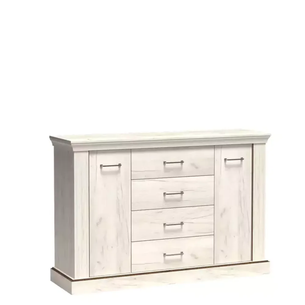 - Komoda ALISANE została wyposażona w cztery szuflady znajdujące się w centralnej części mebla. Dodatkowo posiada dwie szafy umieszczone po bokach, w każdej z nich znajduje się półka.