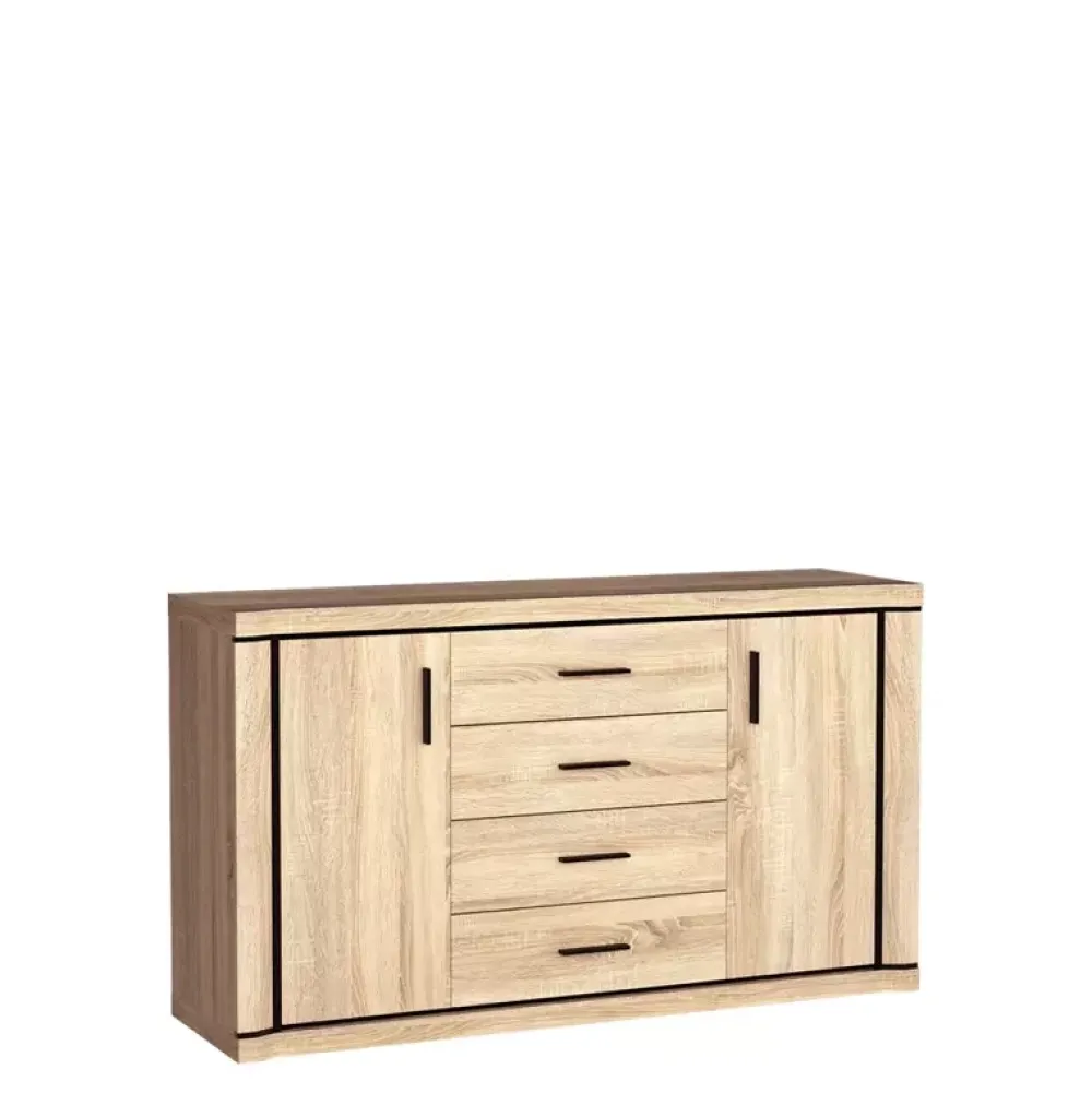 Komoda DENEA to bardzo pojemna propozycja, która pozwoli ci przechować część garderoby. Komoda została wyposażona w półkę za swoimi lewymi oraz prawymi drzwiami, natomiast w jej centralnej części swoje miejsce znalazły cztery pojemne szuflady. Komoda dzięki wykonaniu w nowoczesnej stylistyce doskonale odnajduje się we współczesnych aranżacjach salonów.