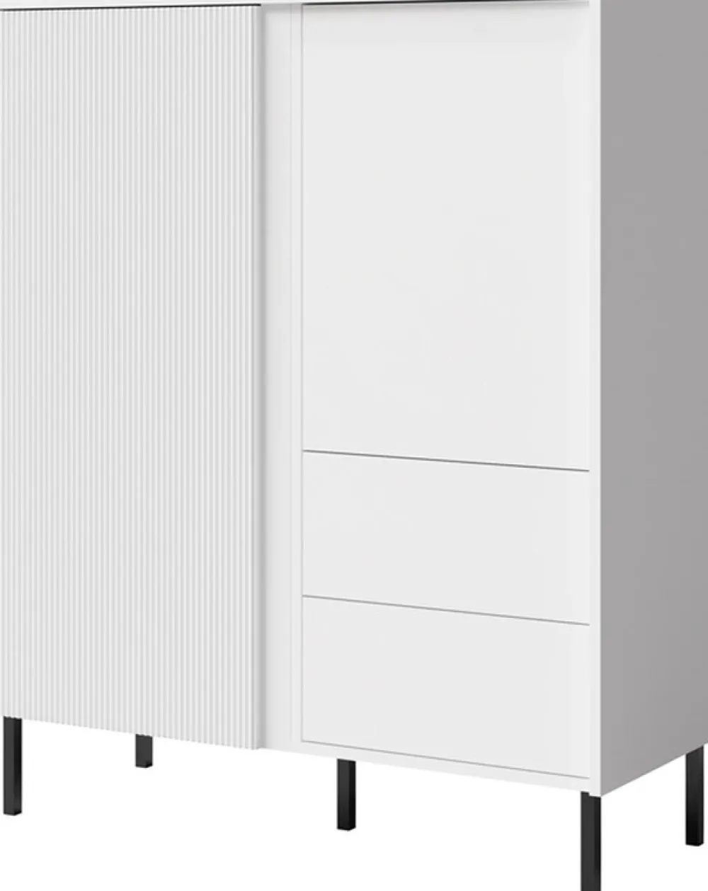 Wysokie, metalowe nóżki w kolorze czarnym nie tylko dodają meblowi lekkości, ale także ułatwiają utrzymanie czystości pod nim, minimalizując osadzanie się kurzu. Wysoka komoda do salonu otwiera się za pomocą mechanizmu push to open – wystarczy jedno dotknięcie, aby zyskać dostęp do przechowywanych rzeczy, co podkreśla jej nowoczesny charakter.