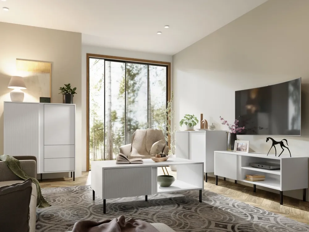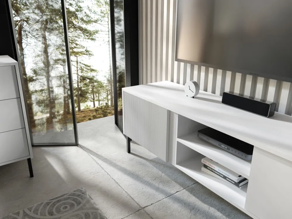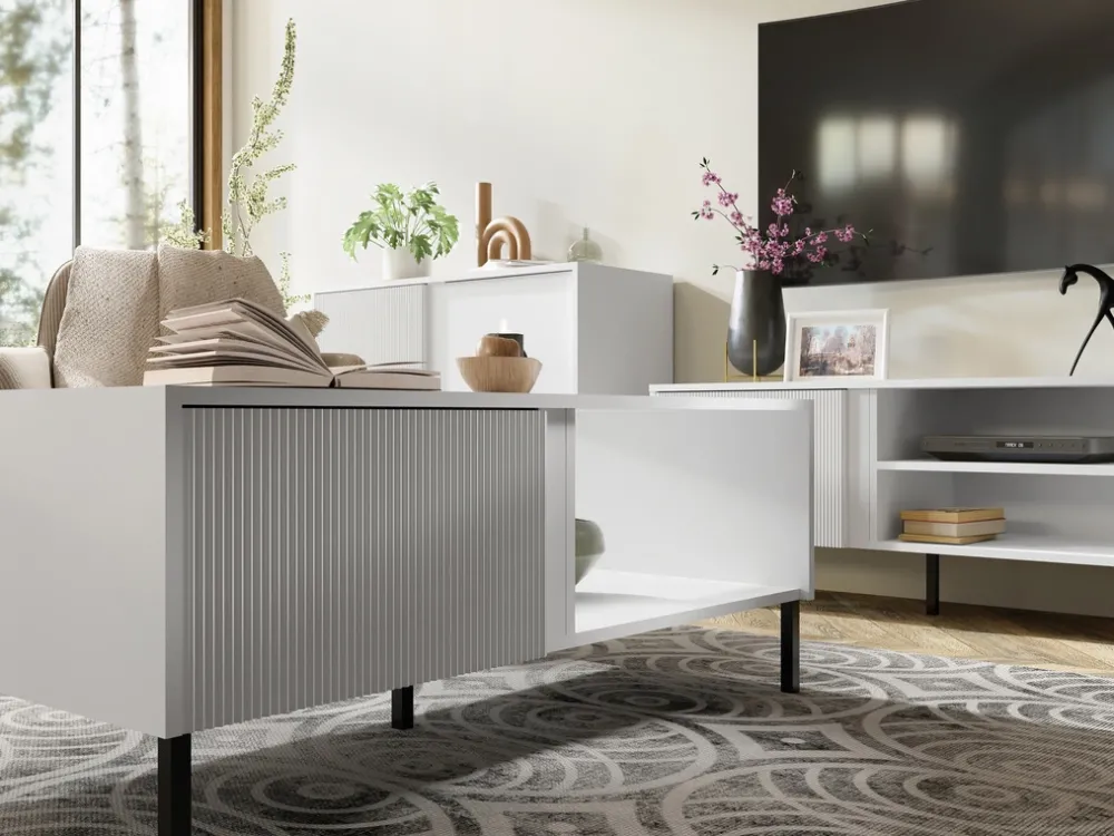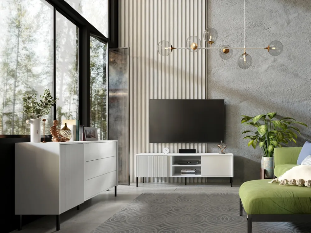 Nowoczesna komoda do salonu wykonana jest z wysokiej jakości płyty laminowanej o grubości 16 mm. Materiał ten jest odporny na zarysowania oraz łatwy do utrzymania w czystości, co gwarantuje, że mebel zachowa świetny wygląd przez długi czas. Front ozdobiony eleganckimi lamelami wykonany jest z solidnej płyty MDF, znanej ze swojej wysokiej trwałości i wytrzymałości.