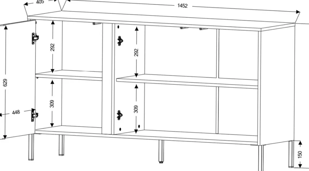 Za każdymi z trojga drzwi komody do salonu kryją się dwie pojemne półki, które zapewniają mnóstwo miejsca na przechowywanie. Niezależnie od tego, czy potrzebujesz przestrzeni na ubrania, dokumenty czy inne przedmioty codziennego użytku, ta komoda sprosta Twoim wymaganiom.