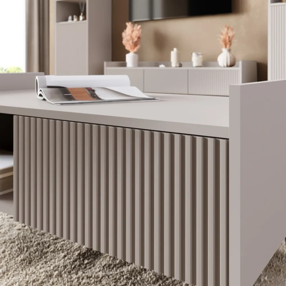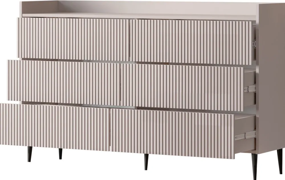 Sześć przestronnych szuflad, osadzonych na trwałych, kulkowych prowadnicach, zapewnia płynne otwieranie i zamykanie, a także komfortowy dostęp do przechowywanych rzeczy. Ryflowane fronty z płyty MDF tworzą przyjemną teksturę, która łamie jednolitą formę mebla, nadając mu wyjątkowego charakteru. Drzwi otwierane za pomocą systemu push to open podkreślają nowoczesny, minimalistyczny wygląd komody, jednocześnie zwiększając wygodę użytkowania.