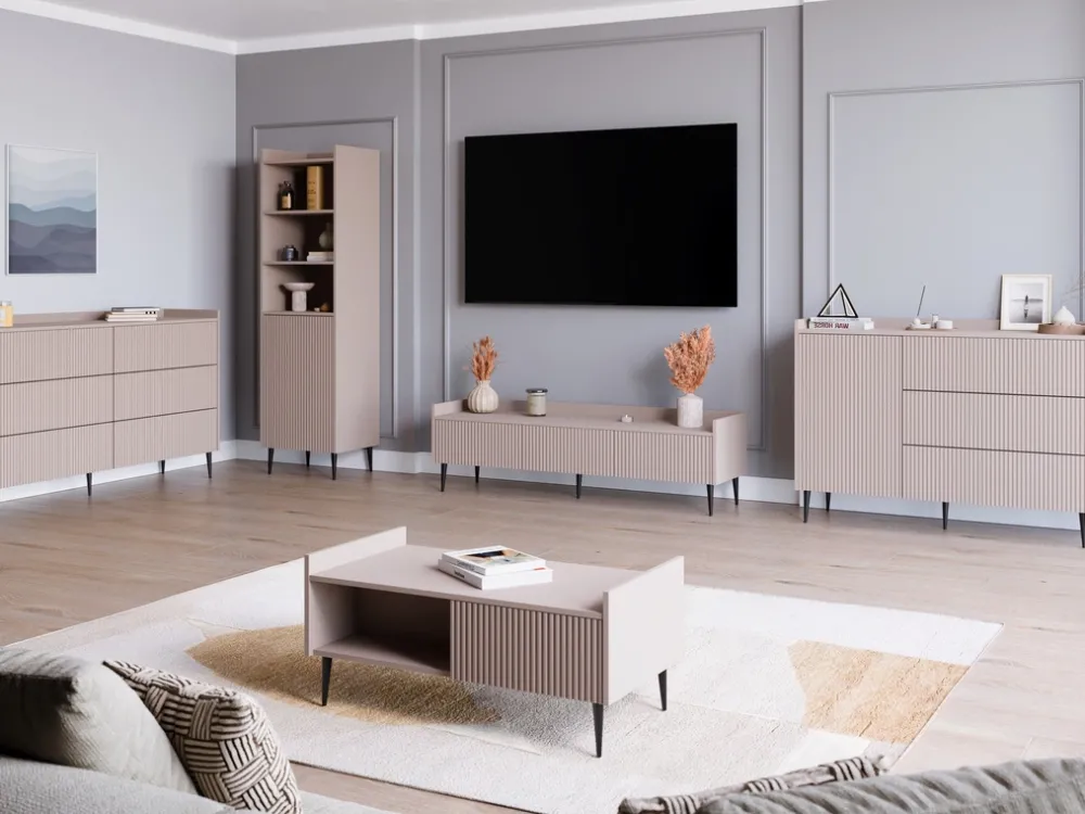 - Ryflowane fronty dodają komodzie eleganckiego i nowoczesnego wyglądu.