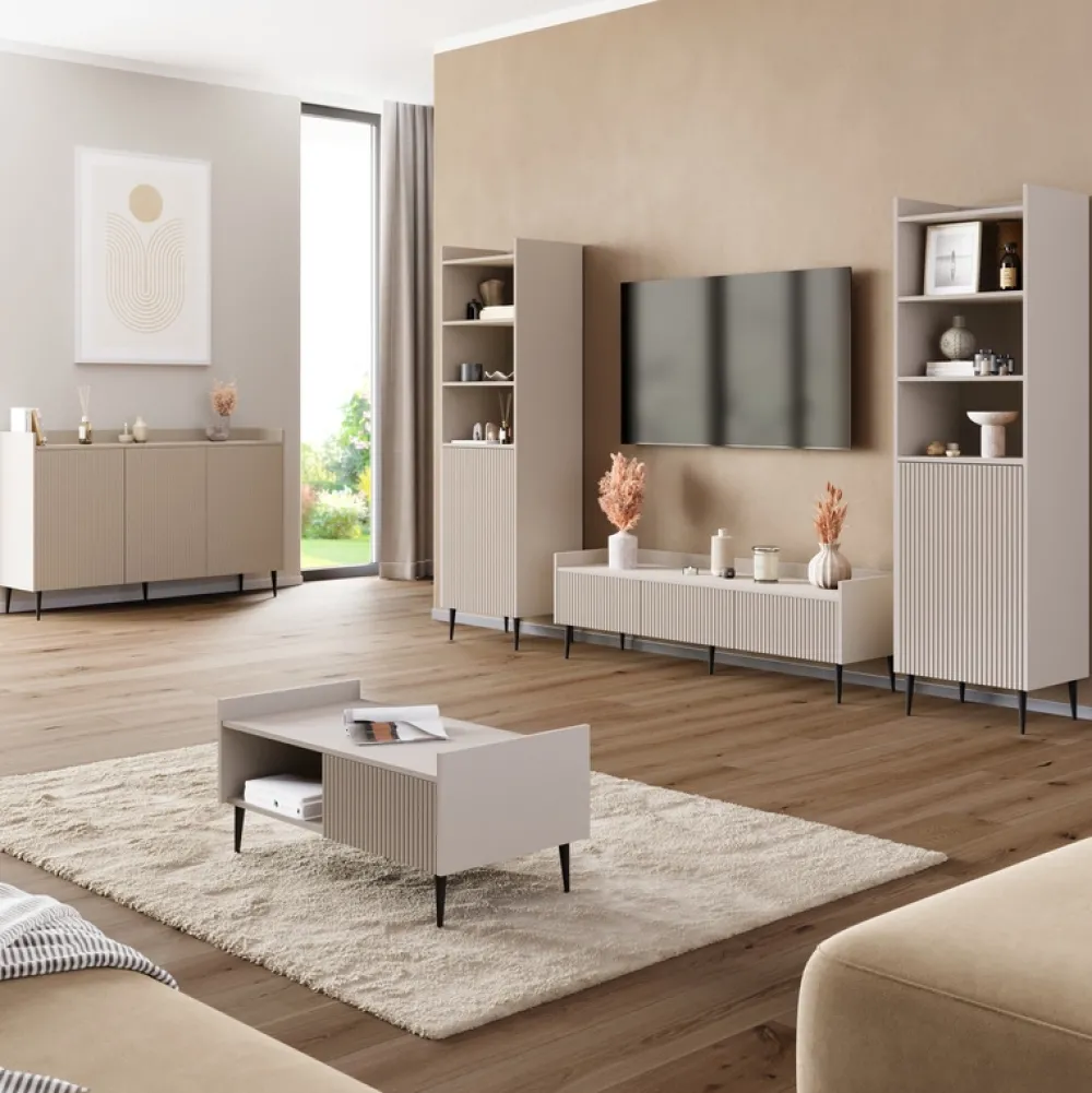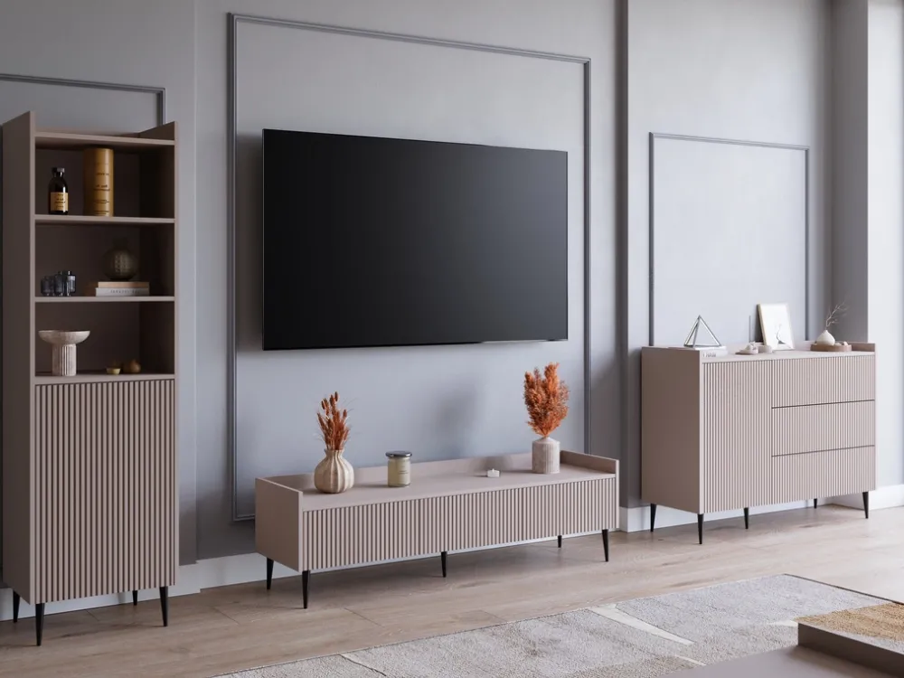 Komoda z szufladami ASPERO to nowoczesne rozwiązanie do salonu, które przyciąga uwagę eleganckim designem i funkcjonalnością. Wykonana w kolorze kaszmir, idealnie komponuje się z różnymi stylami wnętrz – od minimalistycznych po klasyczne, nadając przestrzeni subtelnej elegancji.