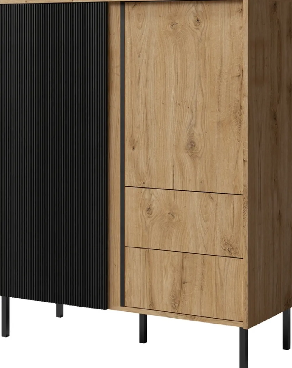 - Komoda w kolorze dąb odwieczny z elementami w kolorze czarnym.