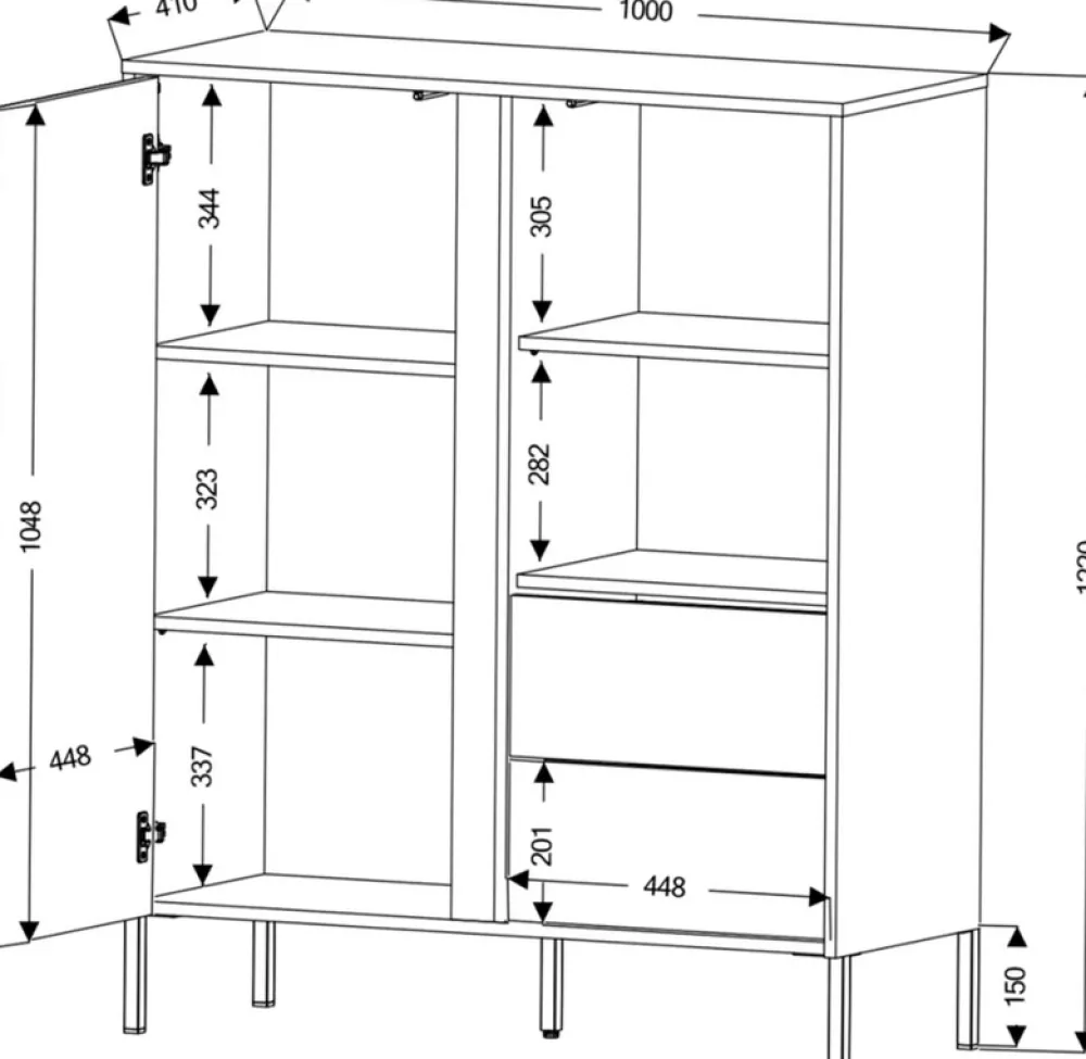 Wysokie, metalowe nóżki w kolorze czarnym nie tylko dodają meblowi lekkości, ale także ułatwiają utrzymanie czystości pod nim, minimalizując osadzanie się kurzu. Wysoka komoda do salonu otwiera się za pomocą mechanizmu push to open – wystarczy jedno dotknięcie, aby zyskać dostęp do przechowywanych rzeczy, co podkreśla jej nowoczesny charakter.