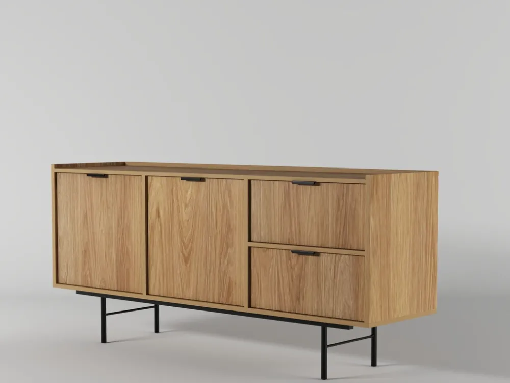 - Komoda ELVIO 150×40×68 cm w kolorze hikory naturalnej. Wyposażona w dwie szafki i dwie szuflady z metalowymi uchwytami. Korpus z laminowanej płyty, obrzeża ABS, nogi metalowe w kolorze czarnym. Praktyczny i elegancki mebel do salonu lub przedpokoju.