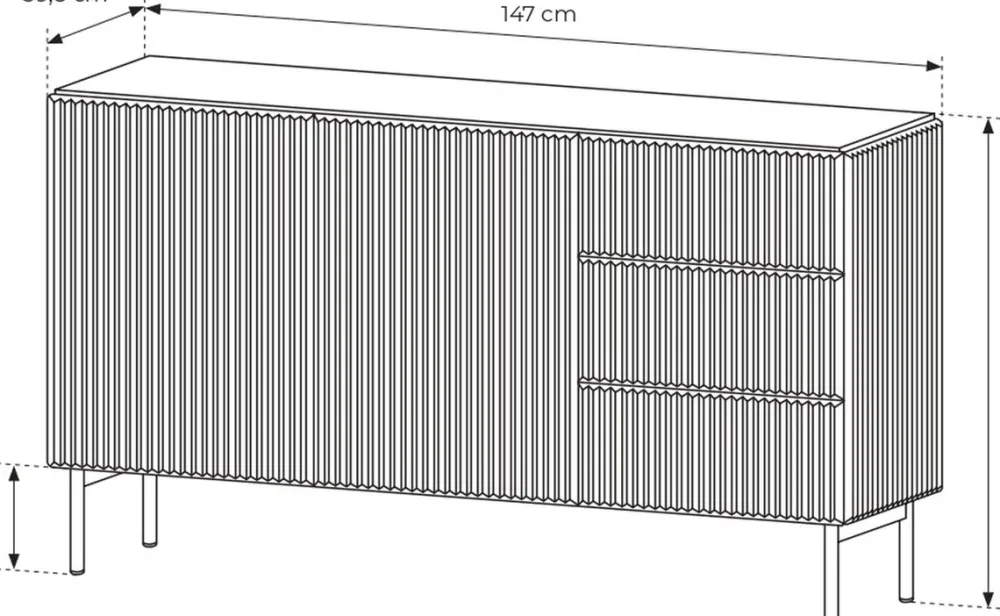 Czarna komoda ryflowana MEZZO to esencja nowoczesnego designu i praktycznego podejścia do organizacji wnętrza. Monochromatyczna forma, wykończona w głębokiej czerni, przyciąga uwagę eleganckimi frezowanymi frontami i minimalistycznym systemem push to open. Trzy pojemne szuflady i dwie zamykane szafki zapewniają przestrzeń, której potrzebujesz na co dzień.