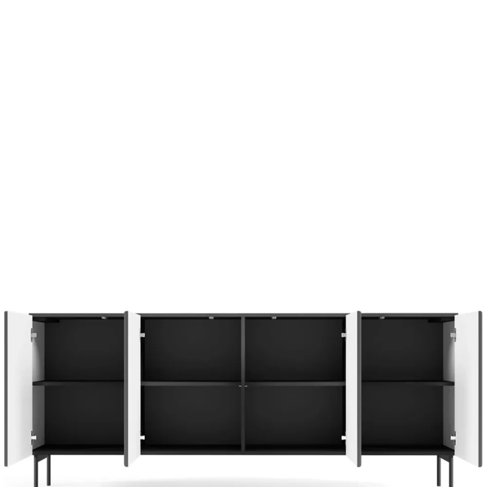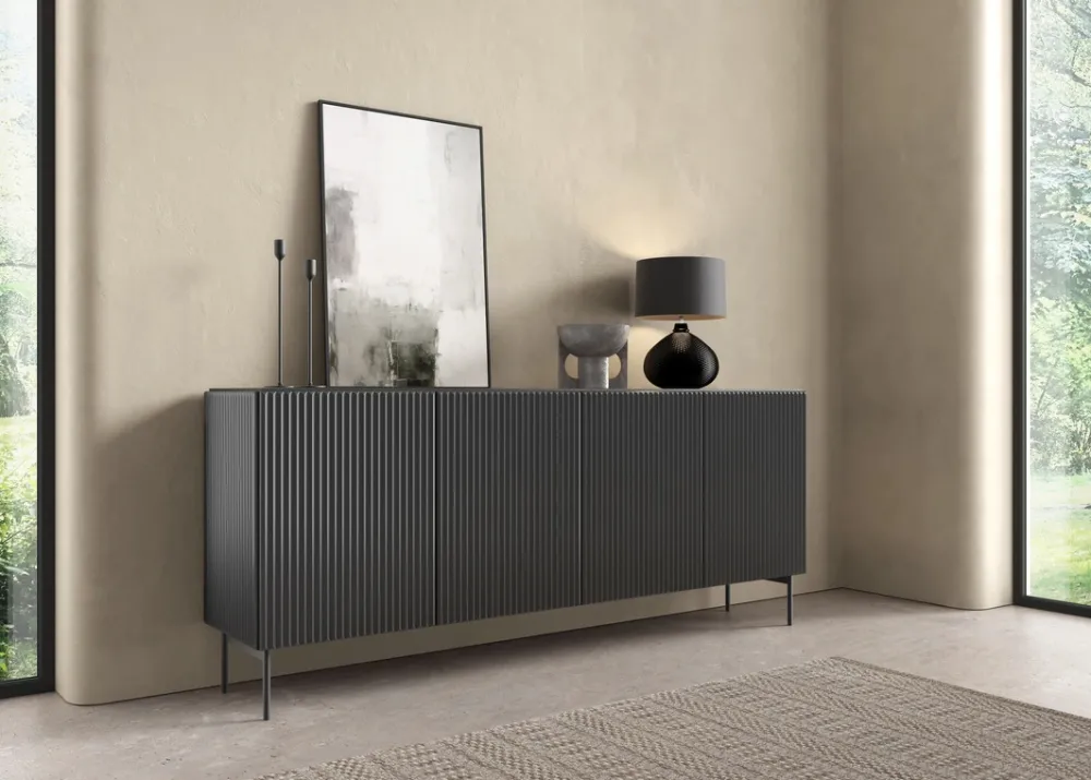 To również doskonała propozycja do wnętrz w stylu japandi, loft czy industrial – czarny kolor i wyraźna faktura frontów przyciągają uwagę i stanowią mocny akcent dekoracyjny. Dzięki swojej konstrukcji, komoda świetnie sprawdzi się jako mebel do przechowywania w strefie dziennej, ale również jako elegancka szafka RTV.