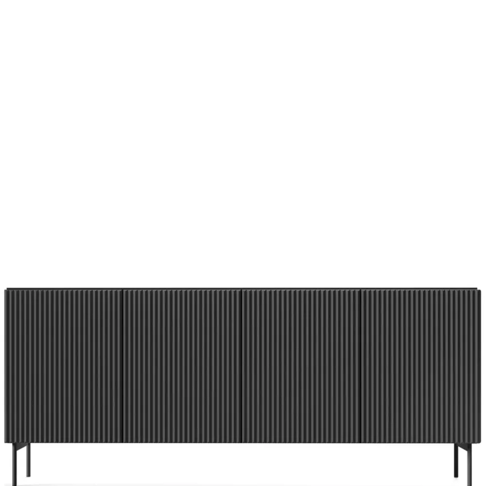 - Komoda ryflowana w kolorze czarnym to nowoczesny mebel o szerokości 195 cm, wyposażony w system push to open, osiem pojemnych komór i czarne metalowe nogi. Frezowane fronty dodają elegancji i tworzą przytulny, spójny akcent we wnętrzu.