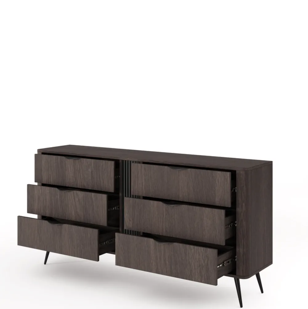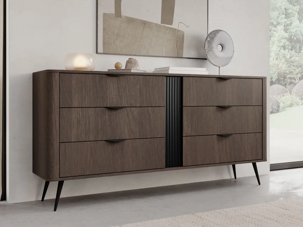 Komoda z kolekcji VALIO to idealne rozwiązanie do nowoczesnych wnętrz, w których liczy się funkcjonalność i wyjątkowy design. Wyposażona w aż sześć pojemnych szuflad, zapewnia doskonałą organizację przestrzeni, a jej charakterystyczny wygląd z ryflowaną czarną wstawką i zaokrąglonymi bokami przyciąga wzrok i dodaje wnętrzu elegancji.