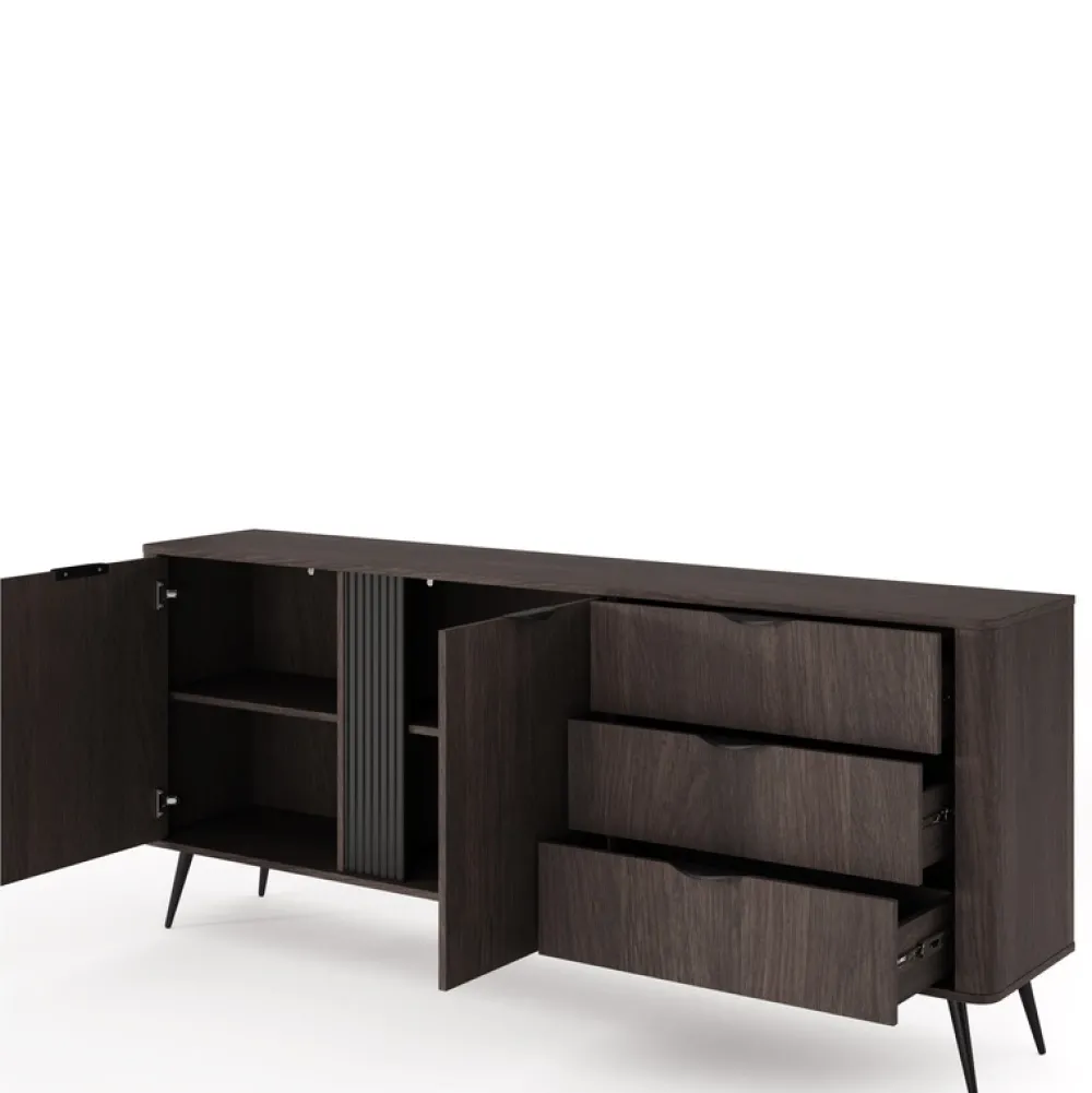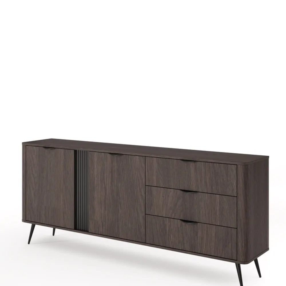 - Komoda VALIO w dekorze dąb Dunin to nowoczesny mebel z trzema szufladami na pełnym wysuwie i szafkami z półkami. Ryflowana wstawka z MDF, czarne metalowe nogi i uchwyty nadają jej elegancki, wyrazisty styl. Idealna do salonu, jadalni lub gabinetu.