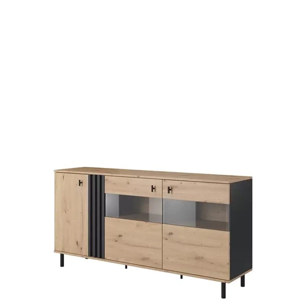 - Trzydrzwiowa komoda o szerokości 165 cm posiada sześć wnęk, w których znajdziesz miejsce na ekspozycję. Możliwość podświetlenia półek – oświetlenie led dostępne w opcji dodatkowej.
