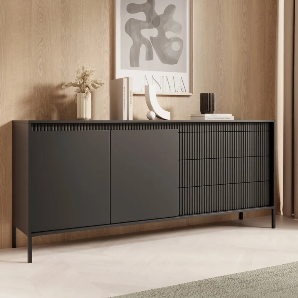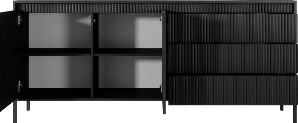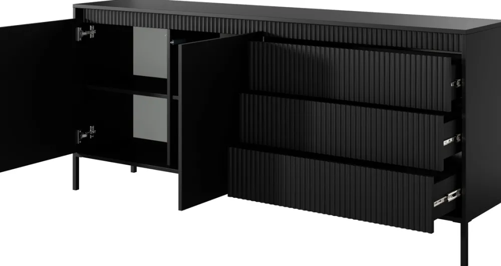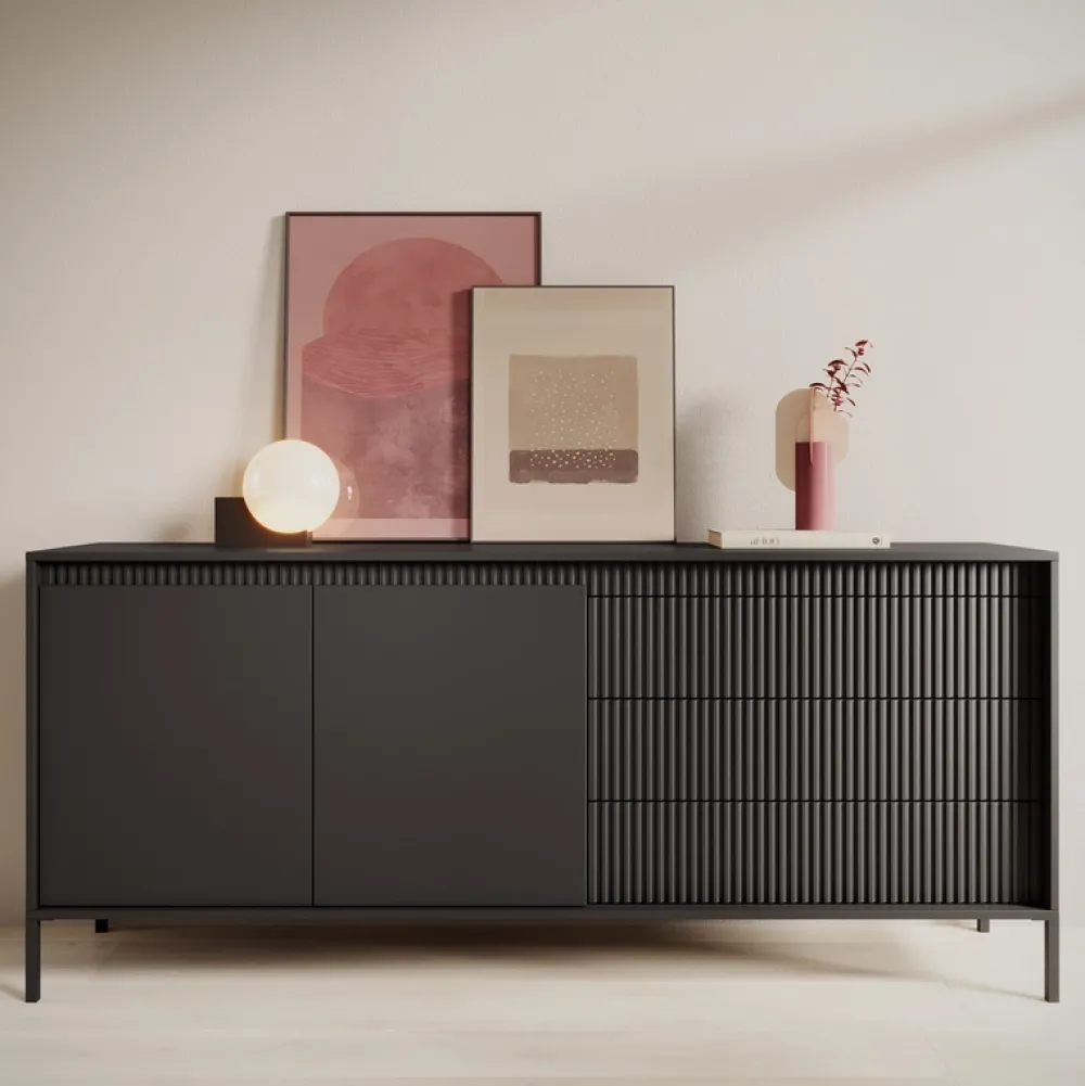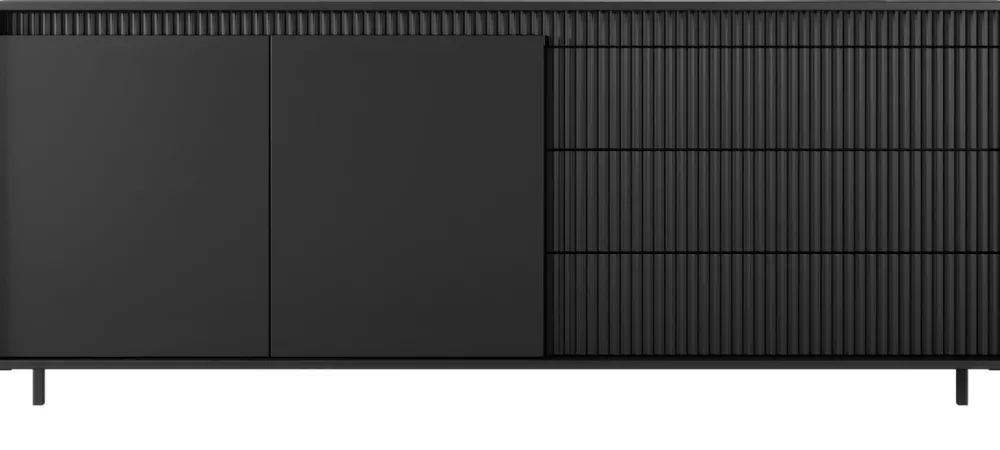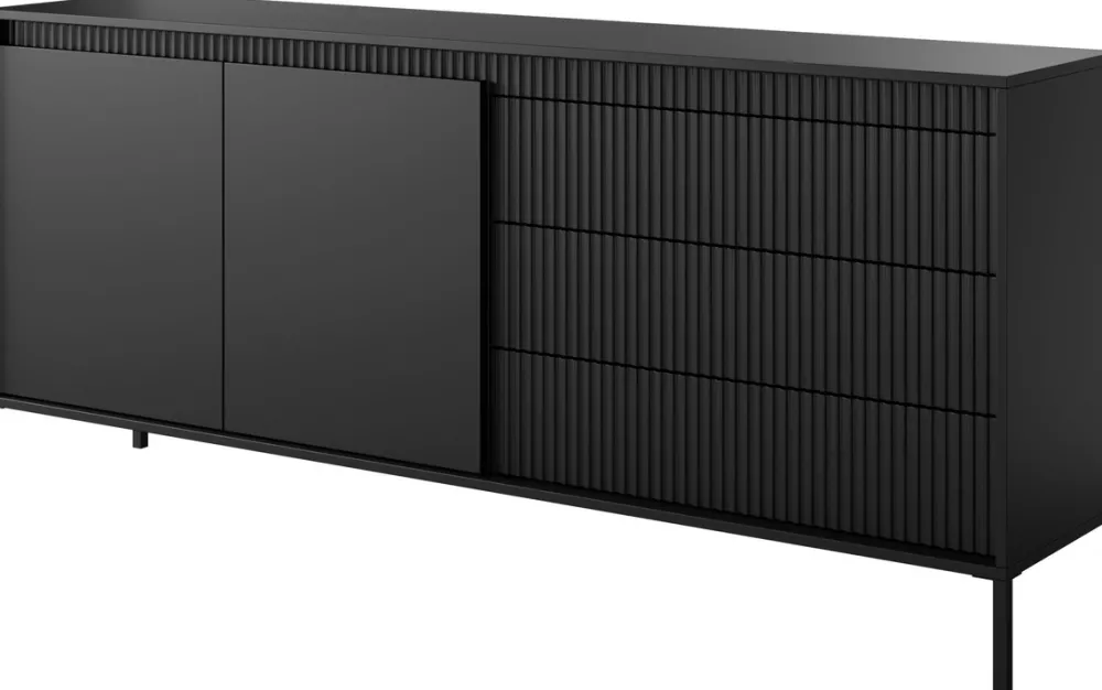 Stylowa i niezwykle pojemna komoda o szerokości 187 cm to idealny wybór do przestronnych salonów, w których liczy się zarówno design, jak i komfort codziennego użytkowania. Po lewej stronie znajdują się dwoje drzwi skrywające aż cztery półki, które pomogą Ci utrzymać porządek. Po prawej – trzy pojemne szuflady, doskonałe na drobiazgi i niezbędne akcesoria. Frezowane fronty z płyty MDF dodają meblowi elegancji, a wysokie metalowe nóżki wprowadzają nowoczesny, lekki charakter.