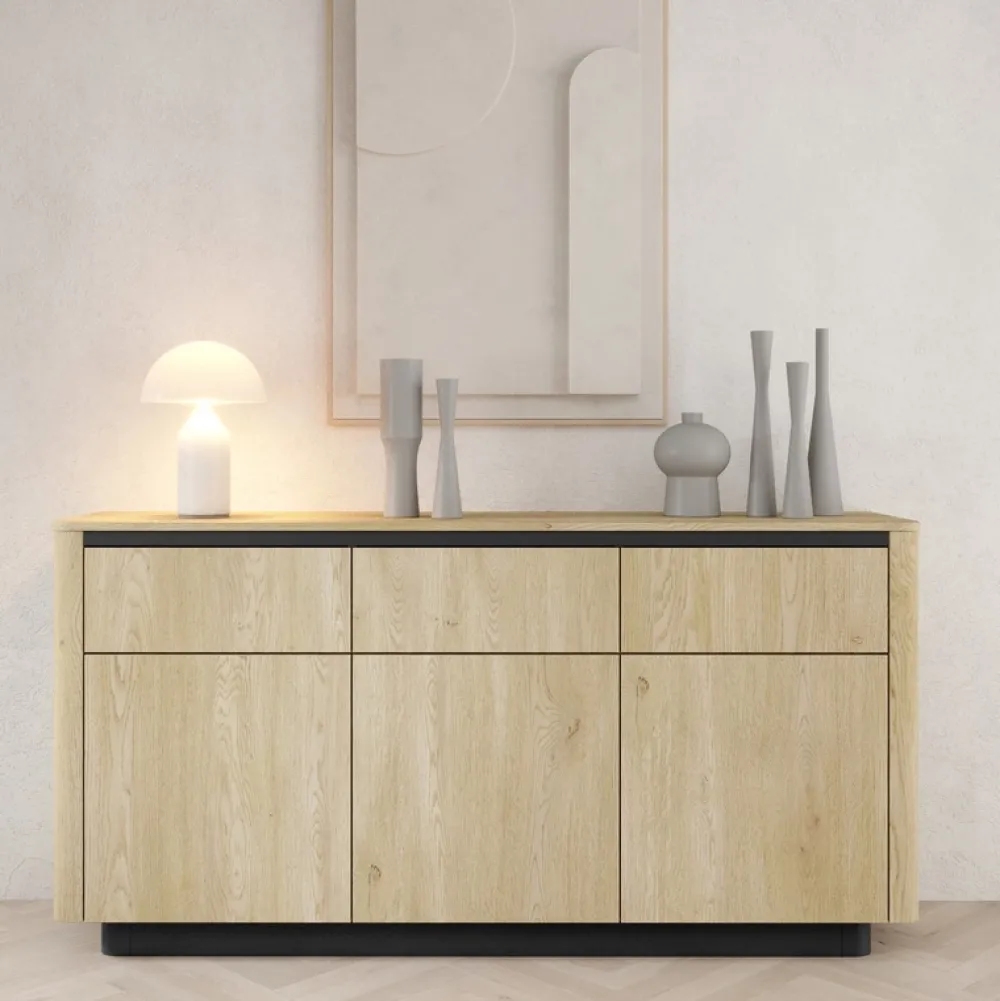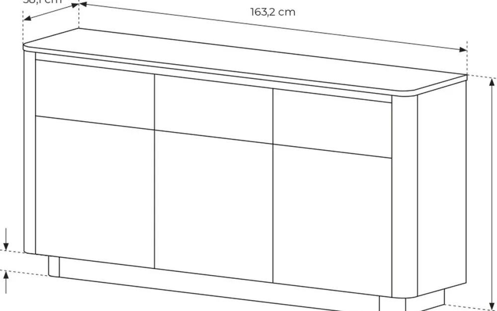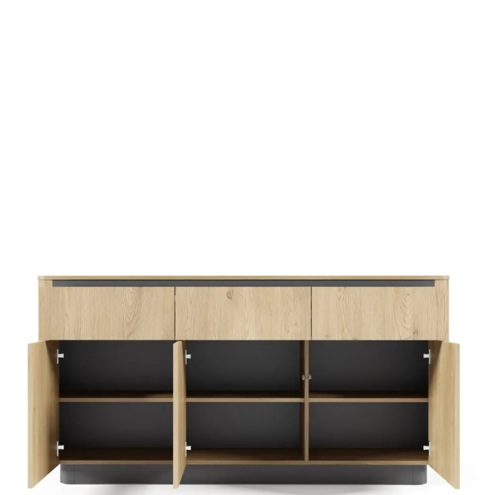 Dzięki szerokości ponad 160 cm komoda oferuje dużą powierzchnię blatu – idealną na dekoracje, lampę czy ramki ze zdjęciami. Wnętrze zostało podzielone na praktyczne strefy: szuflady na podręczne akcesoria, dokumenty czy sztućce, oraz głębokie półki za drzwiczkami, które pomieszczą większe przedmioty.