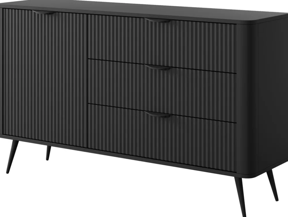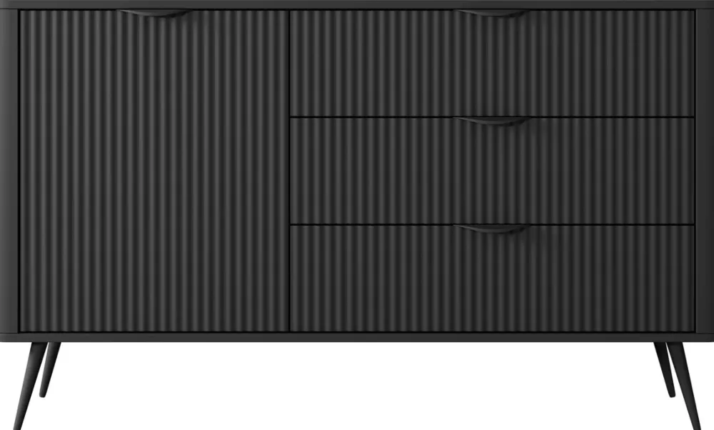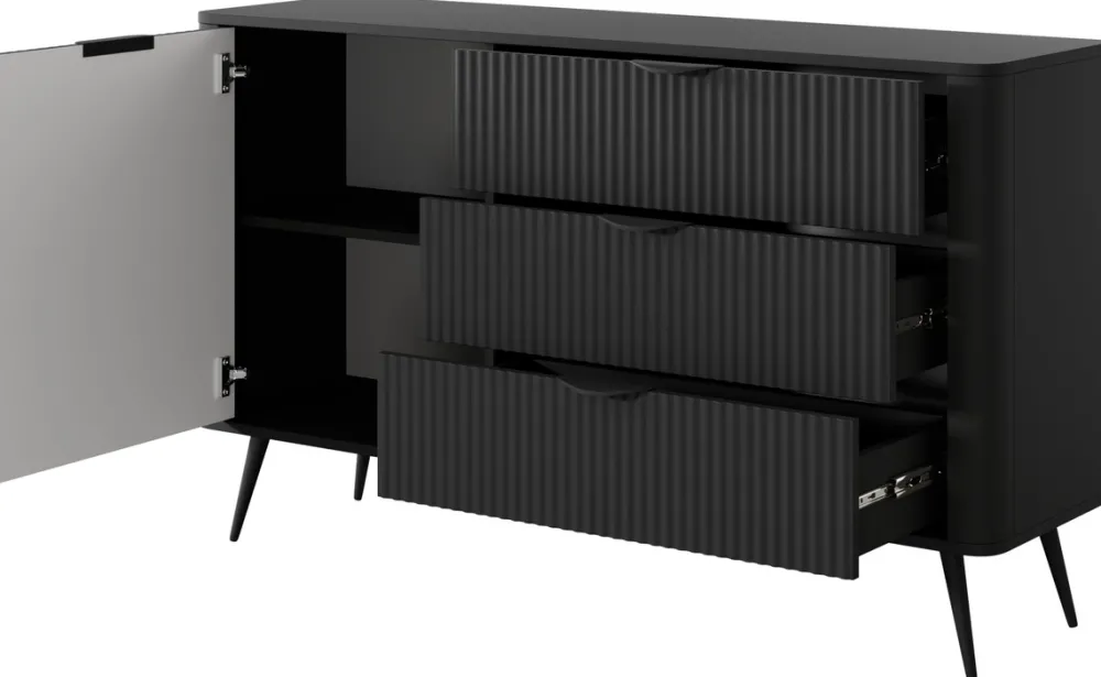 - Komoda LEONTE 138 cm w kolorze czarnym z 3 szufladami i szafką. Czarne uchwyty i nogi podkreślają elegancki styl. Praktyczne przechowywanie i nowoczesny wygląd – idealna do salonu, sypialni lub przedpokoju.