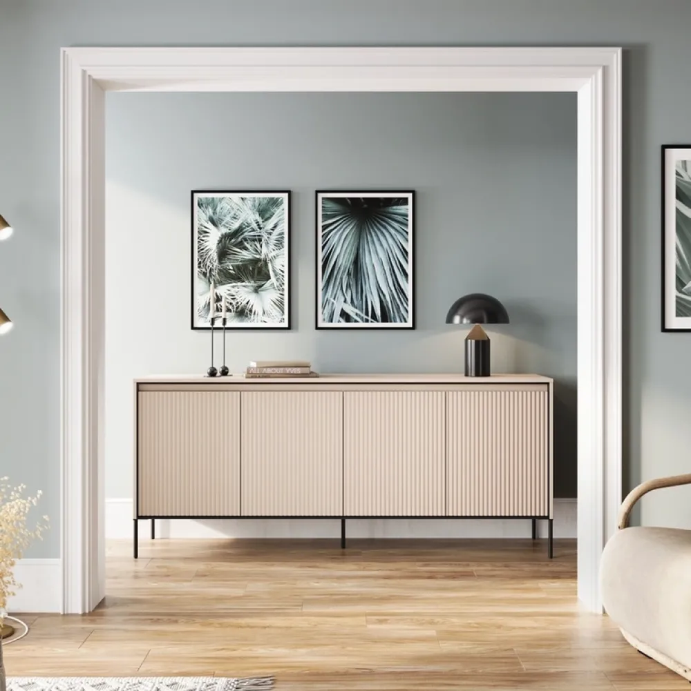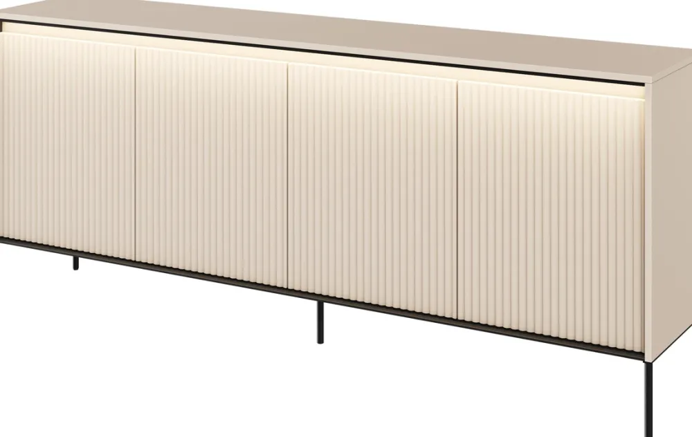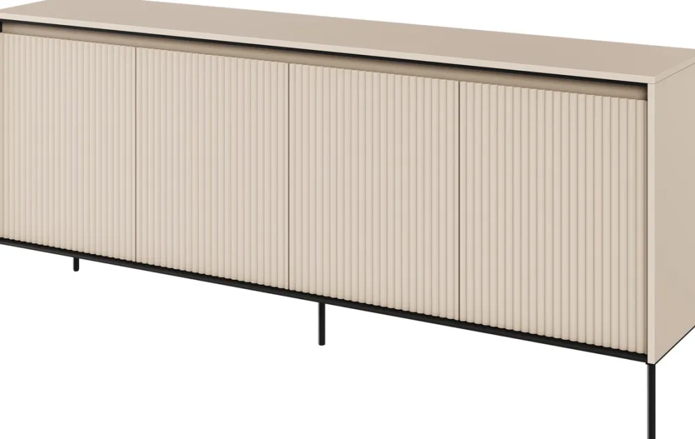 Ta szeroka, czterodrzwiowa komoda z frezowanymi frontami to doskonała propozycja dla tych, którzy cenią nowoczesny design i funkcjonalność. Jej eleganckie linie i wyjątkowy kolor beż piaskowy sprawią, że będzie ona wspaniałym dodatkiem do każdego salonu.