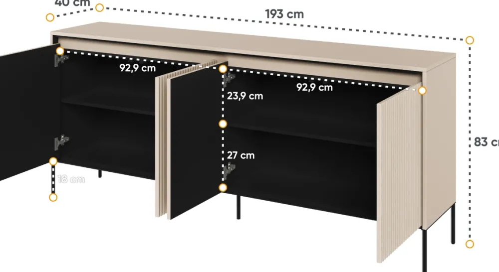 Zapraszamy do odkrycia naszej nowoczesnej komody do salonu TREND, która z pewnością zachwyci każdego miłośnika eleganckiego i funkcjonalnego designu. Ta czterodrzwiowa komoda wyróżnia się swoją imponującą szerokością – 193 cm, pozwala na przechowanie wszystkiego, co tylko potrzebujesz, zachowując jednocześnie porządek i styl.