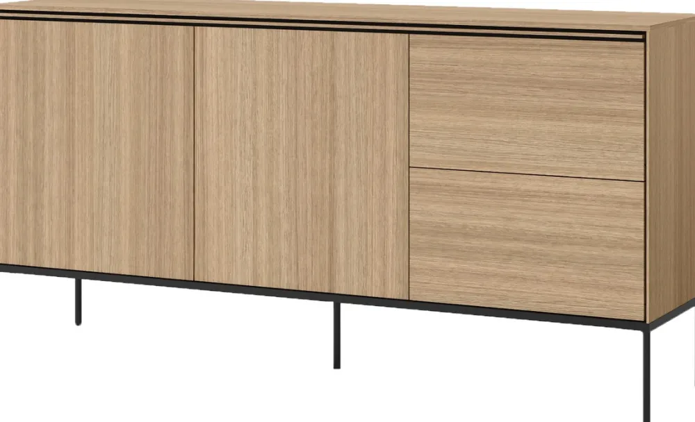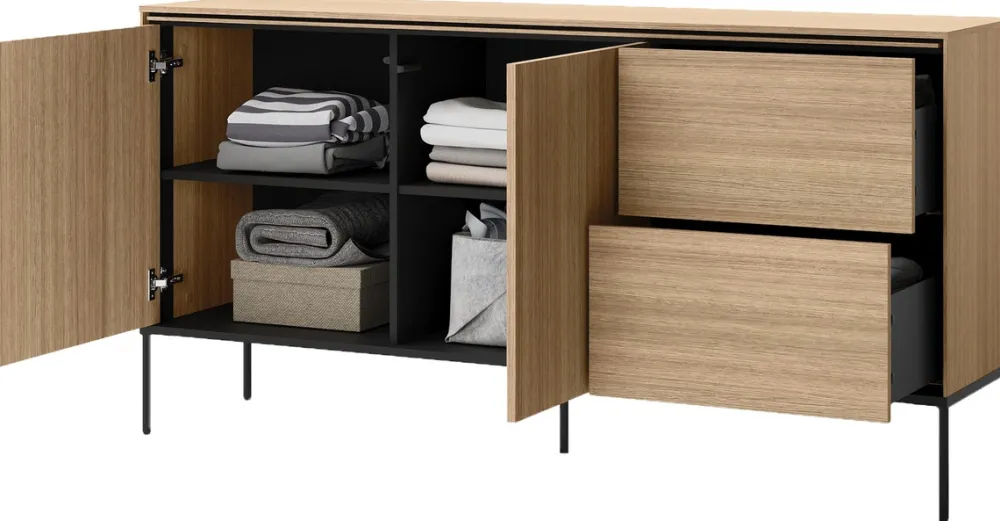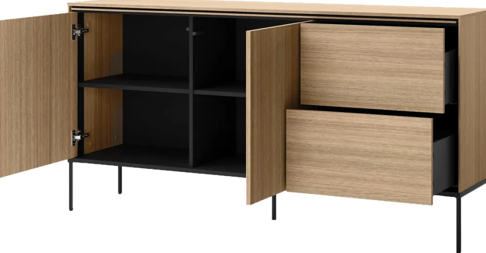 - Komoda do salonu 167 cm VISSO posiada parę drzwi, za którymi znajdują się cztery półki. Po prawej stronie swoje miejsce znalazły dwie pojemne szuflady. Komoda stoi na wysokich czarnych nóżkach, które wykonano z metalu.