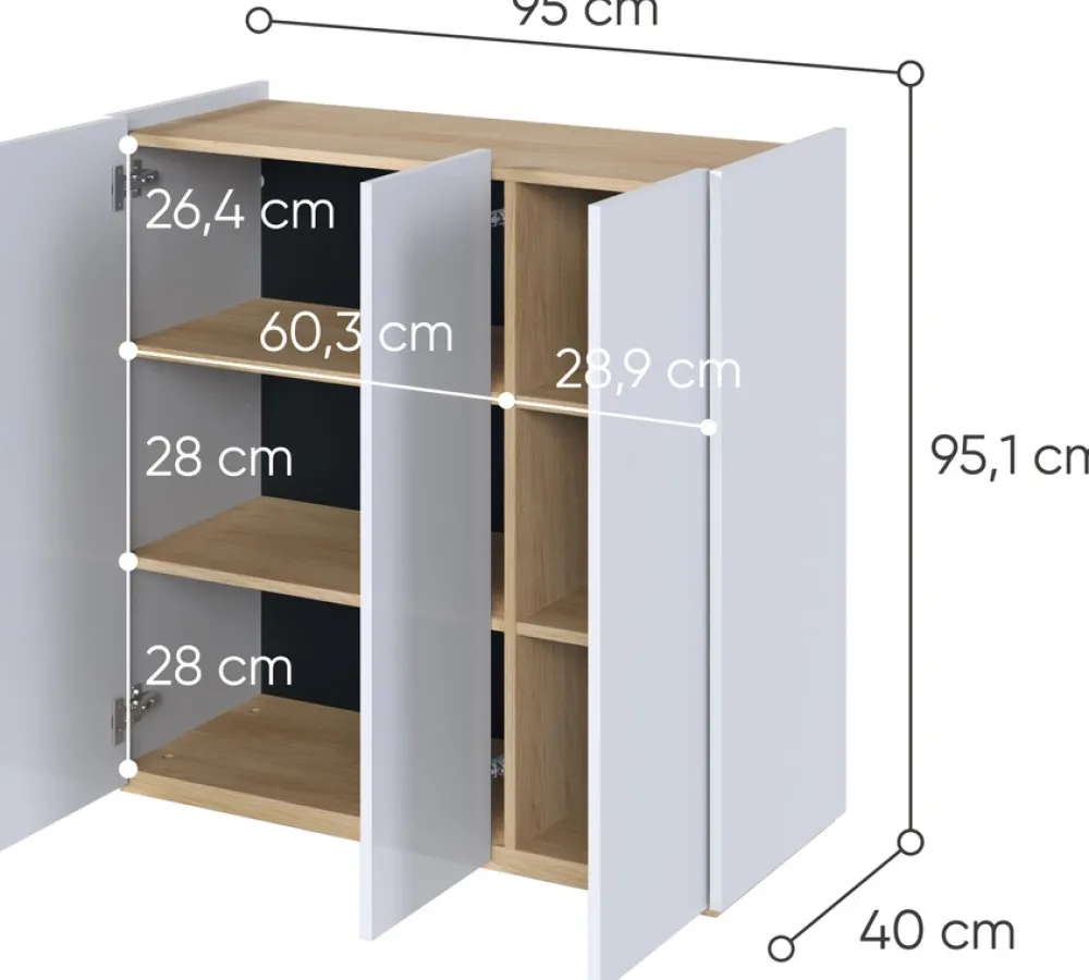 - Nowoczesna komoda o szerokości 95 cm EASY posiada troje drzwi, za którymi kryje się sześć półek gotowych na przechowywanie różnych przedmiotów i akcesoriów. Fronty komody wykończone zostały w białym połysku i posiadają cichy domyk.