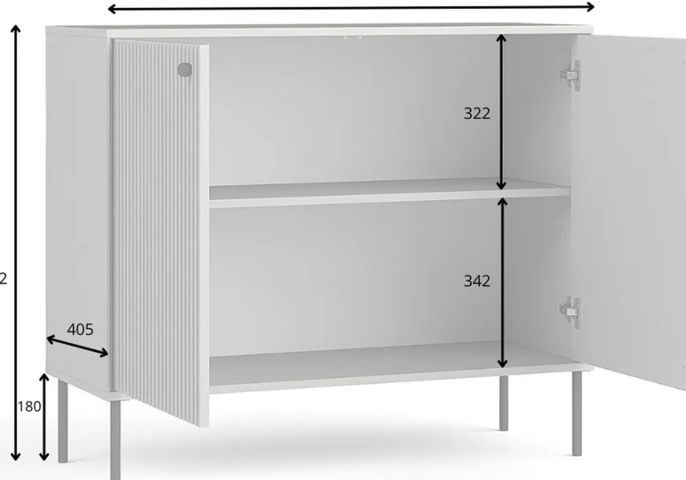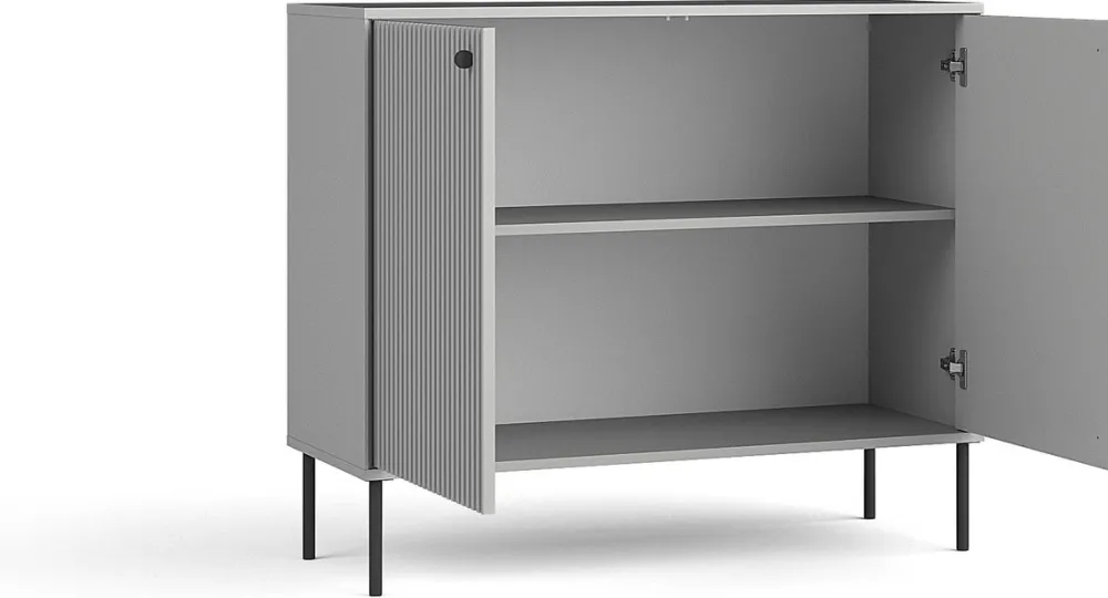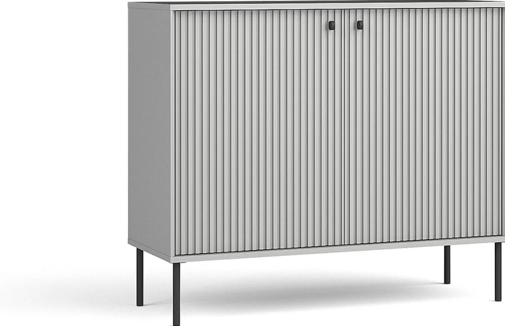 - Komoda IRYS 105 cm w eleganckim odcieniu szarości z ryflowanymi frontami MDF, metalowymi nogami i uchwytami. Dwudrzwiowa, z dwiema półkami – idealna do salonu, sypialni lub przedpokoju. Styl nowoczesny, loft i skandynawski w jednym.