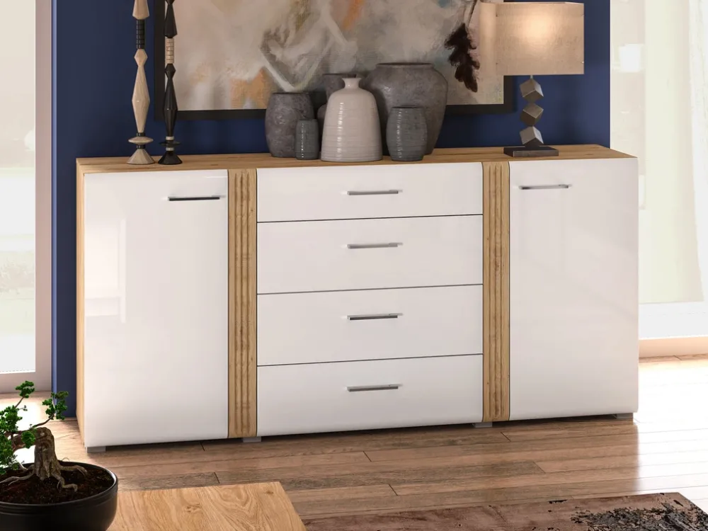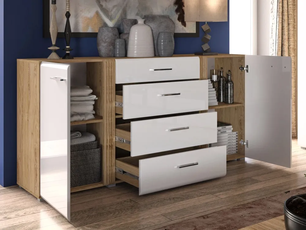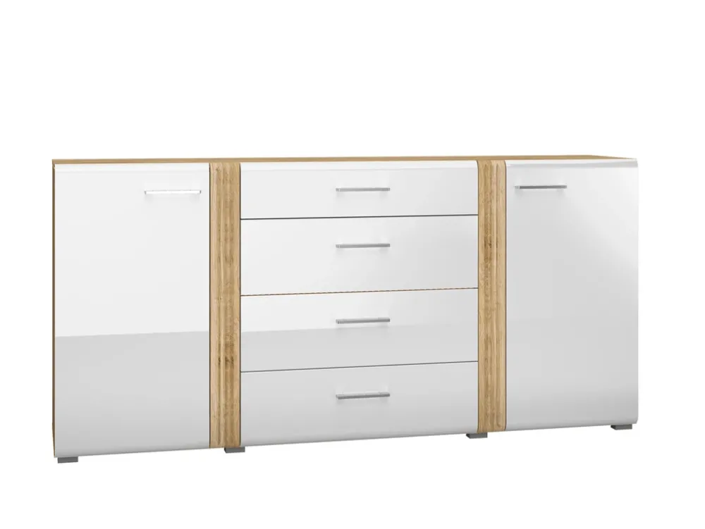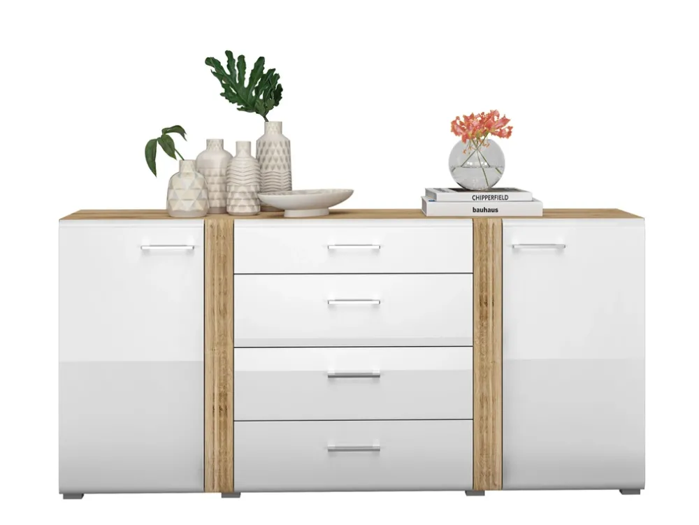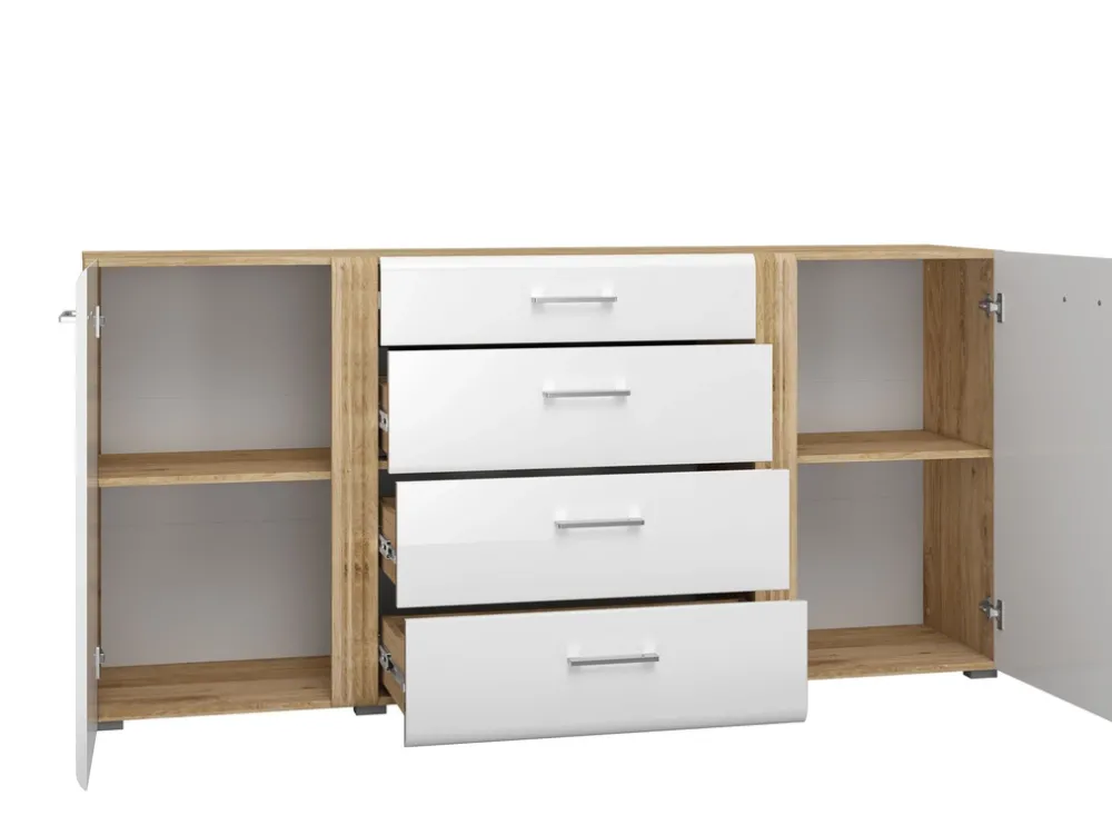 Centralna część mebla to cztery pojemne szuflady, które oferują mnóstwo miejsca na przechowywanie. Dzięki nim wszystkie potrzebne rzeczy będą zawsze pod ręką, a jednocześnie schowane przed wzrokiem gości. Każda szuflada jest wyposażona w chromowane metalowe uchwyty, które dodają komodzie nowoczesnego charakteru i ułatwiają codzienne korzystanie.