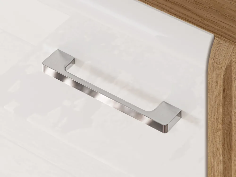 - Uchwyty zostały wykonane z metalu w kolorze chromu. Elegancki kształt doskonale komponuje się z całokształtem mebla.