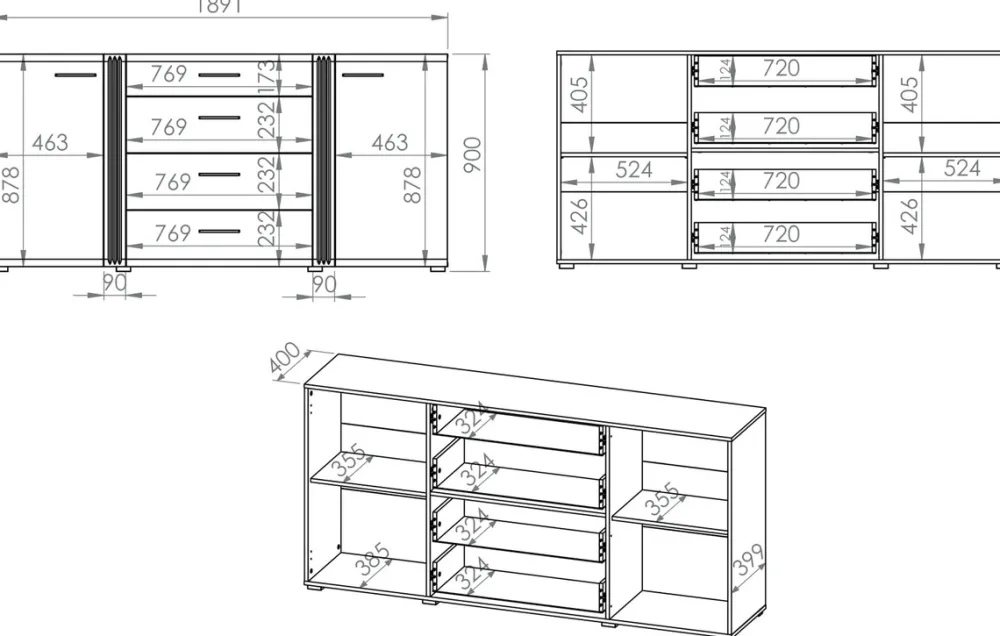 Po lewej i prawej stronie komody znajdują się drzwi wyposażone w system cichego domyku. To innowacyjne rozwiązanie zapewnia nie tylko komfort użytkowania, ale również dba o ciszę i spokój w Twoim domu. Za tymi drzwiami znajdziesz przestronne półki, które pomogą Ci utrzymać porządek, przechowując najróżniejsze przedmioty – od książek po dekoracje.